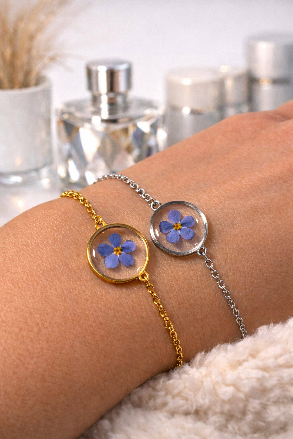 Bracelet réglable Myosotis bleu vraie fleur séchée