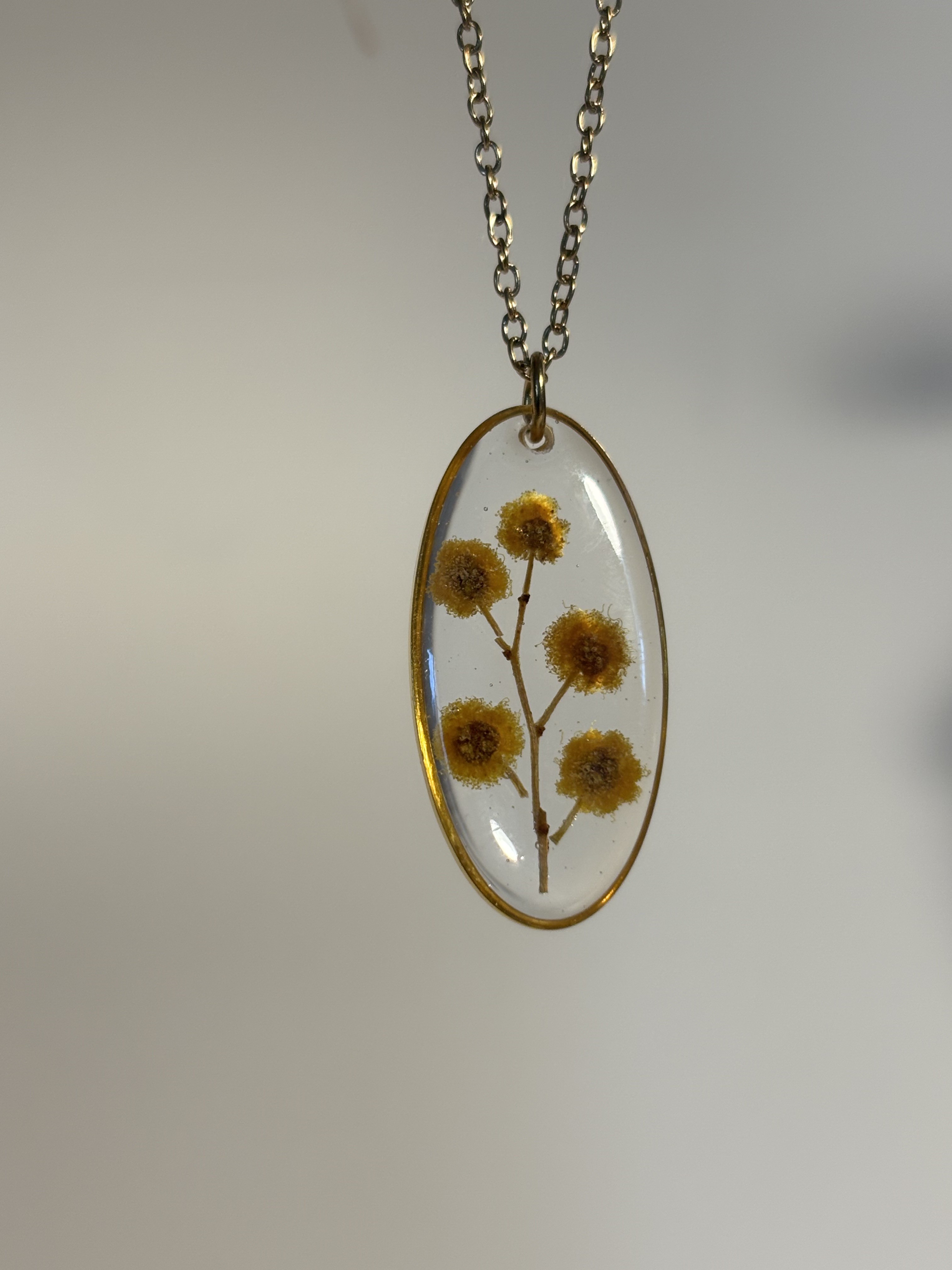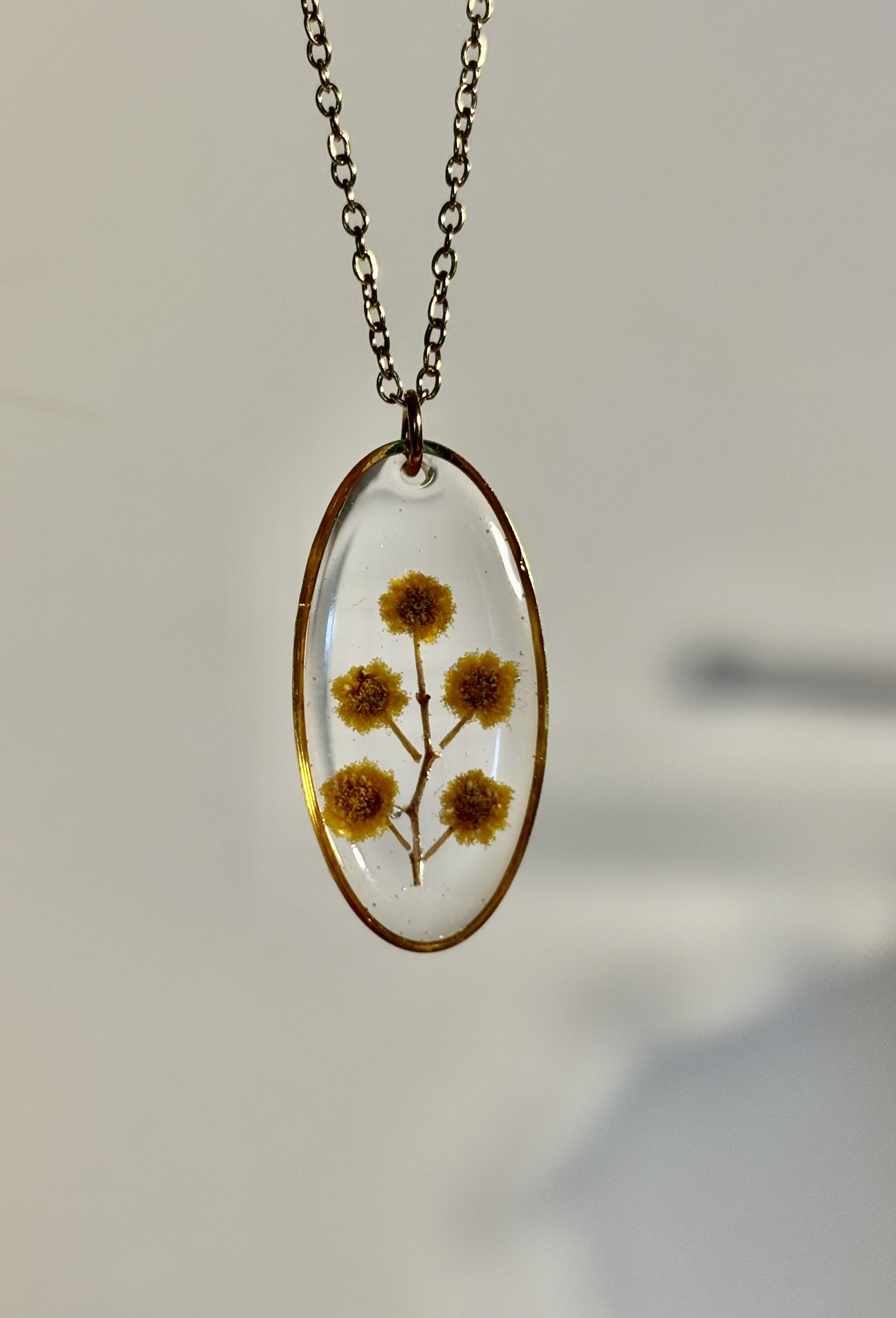 Collier ovale en résine avec fleur de Mimosa – Bijou artisanal en acier inoxydable doré