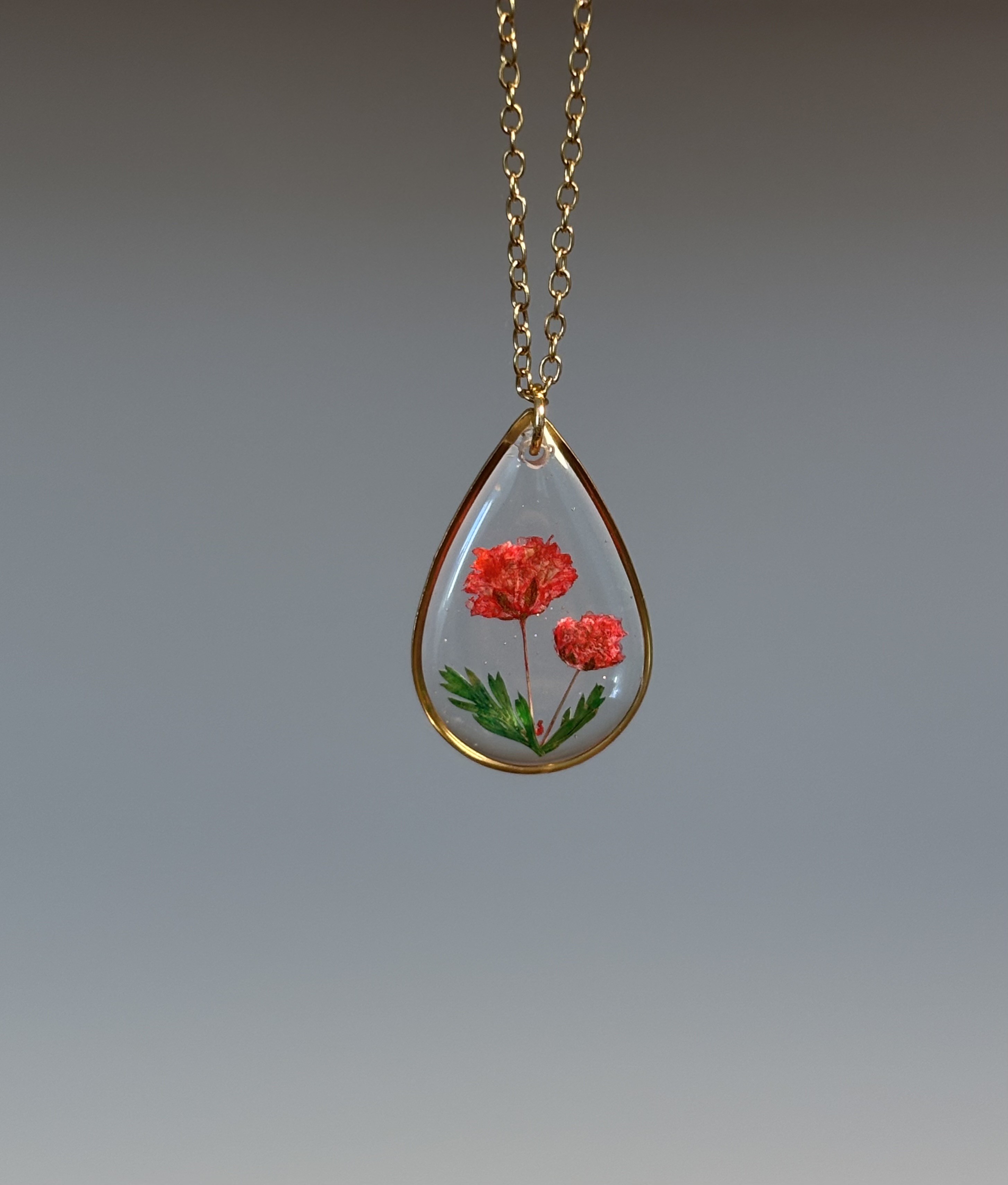 Collier goutte en résine avec fleurs de Gypsohile rouge – Bijou artisanal en acier inoxydable doré
