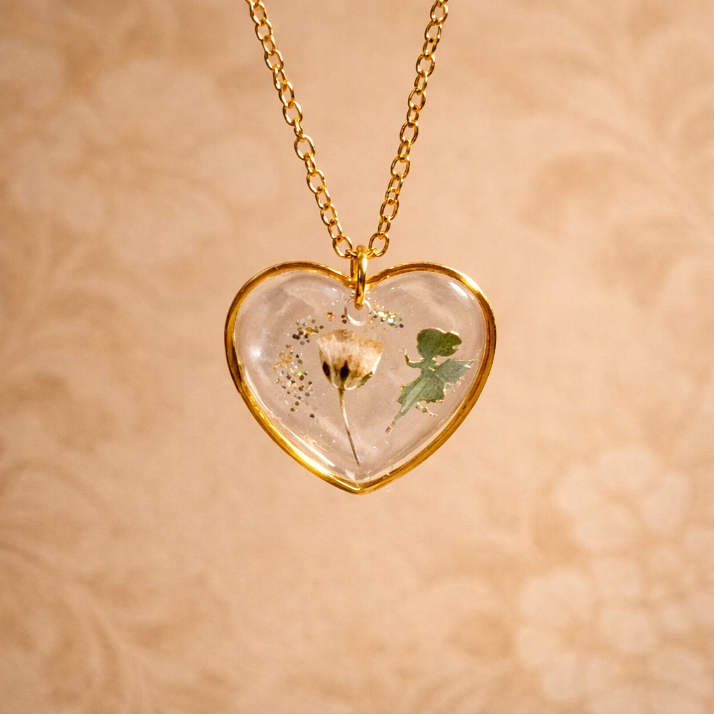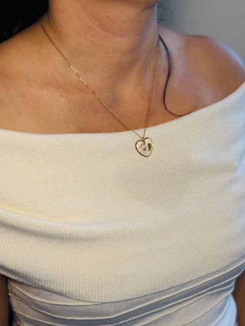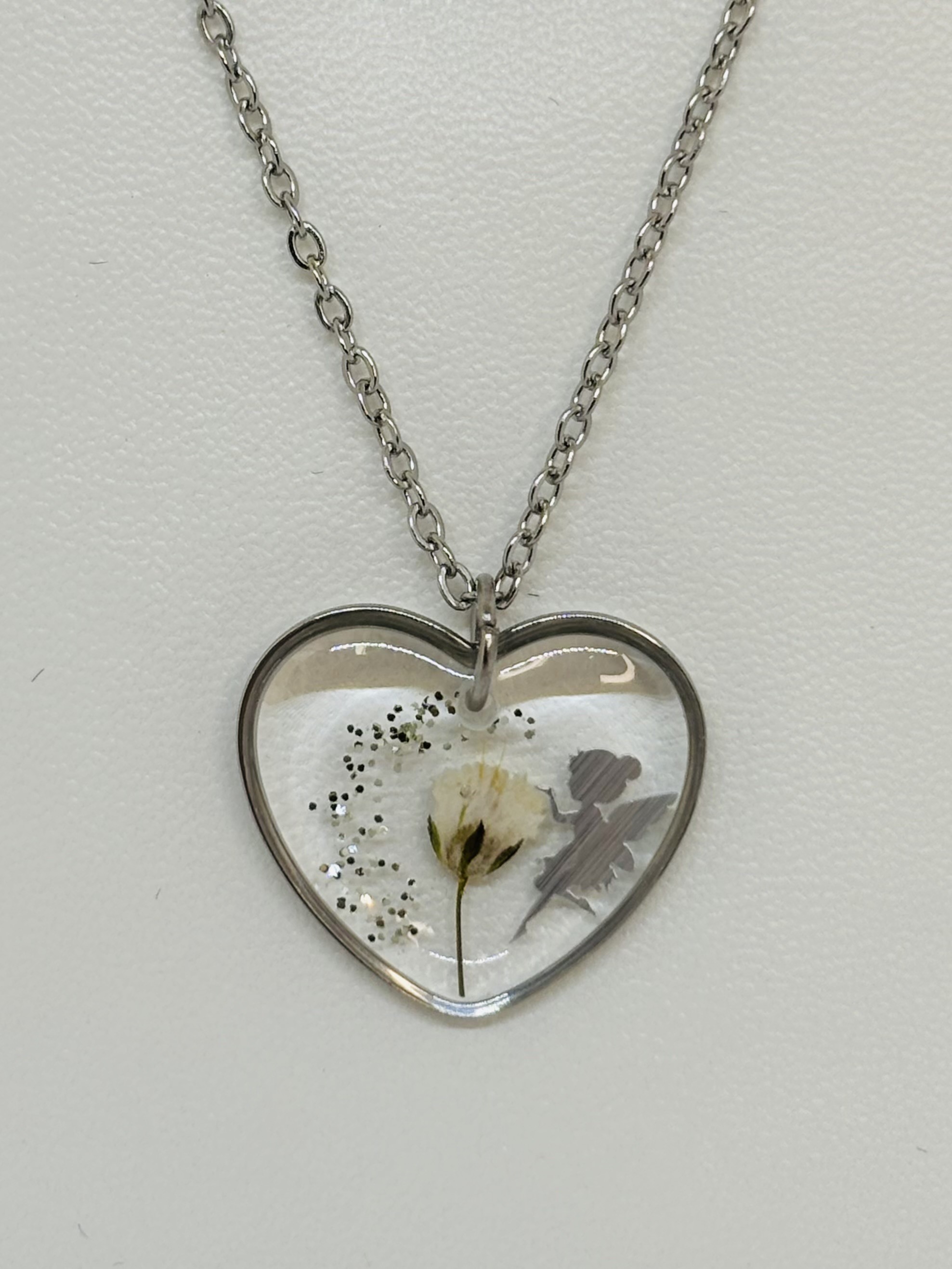 Collier en résine coeur Fée avec fleur de Gypsohile blanche – Bijou artisanal en acier inoxydable doré ou argenté