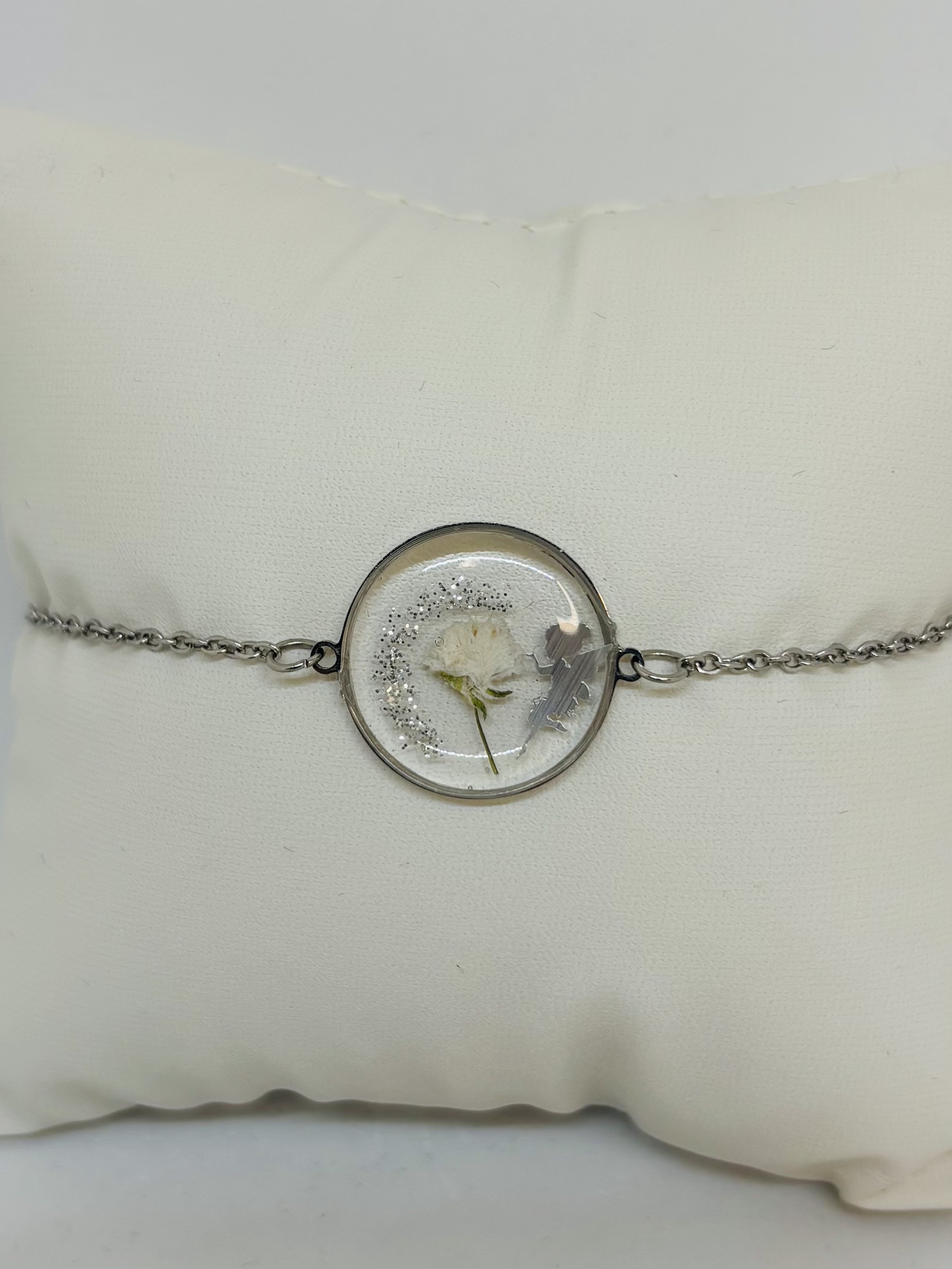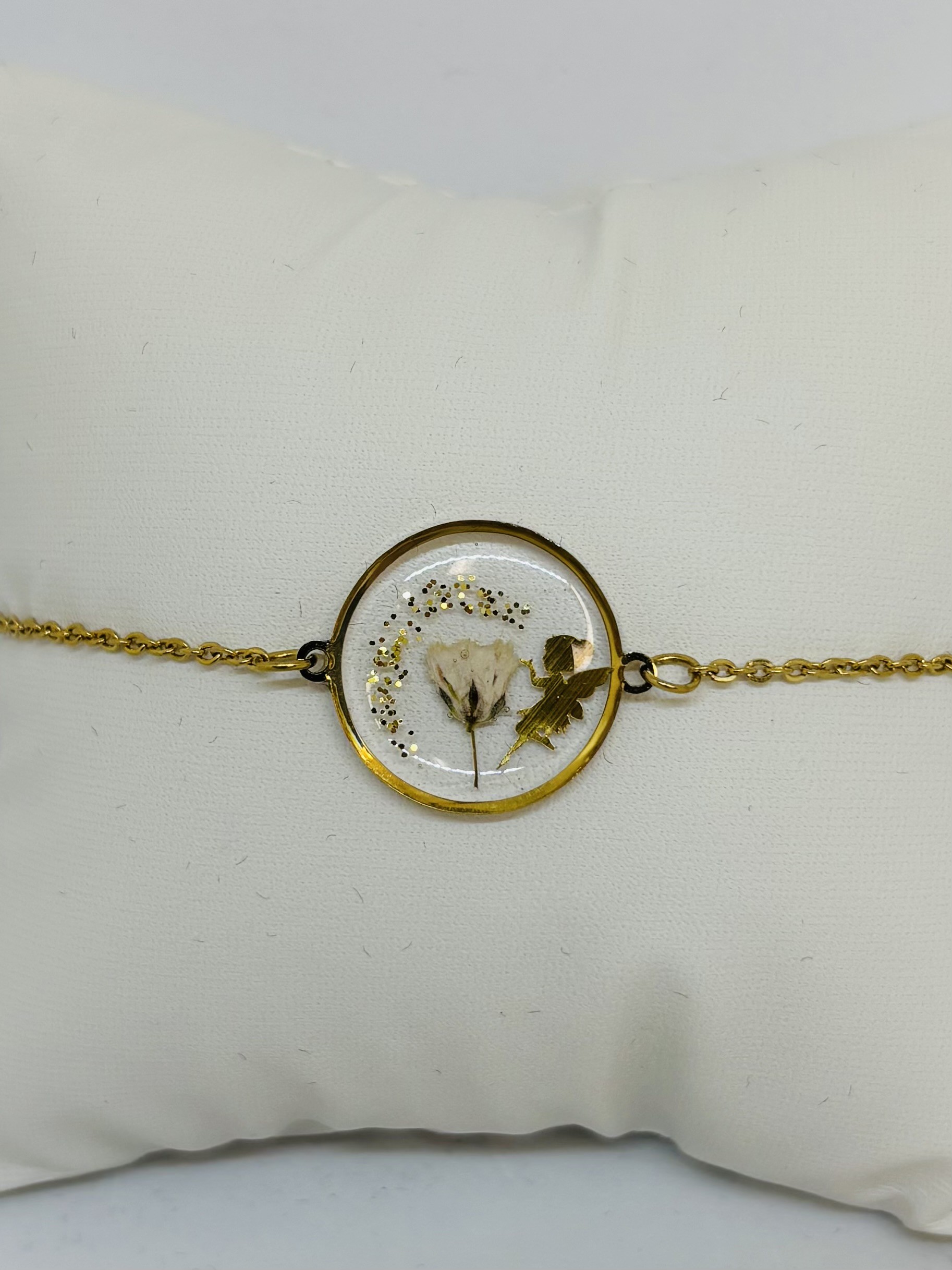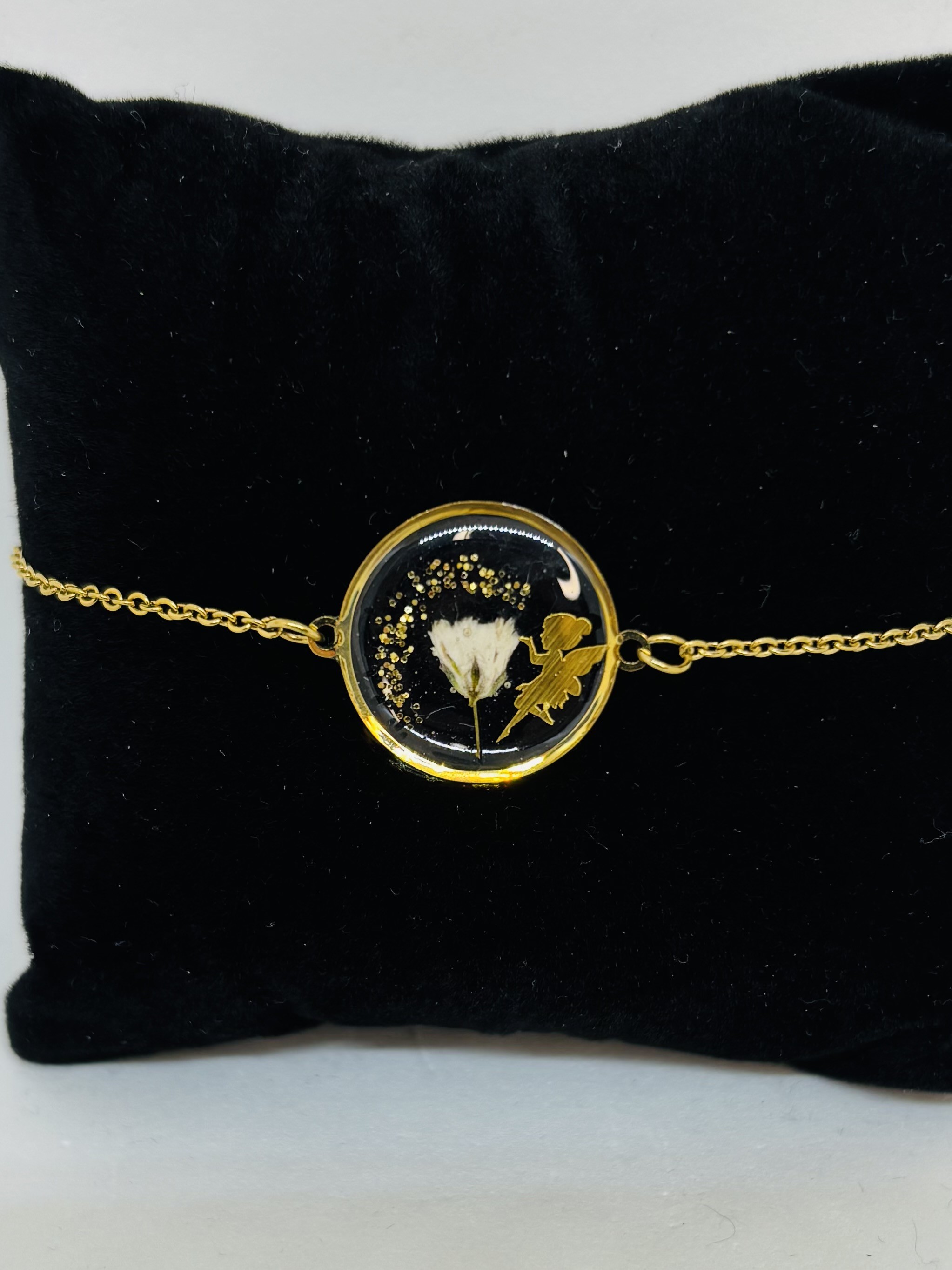 Bracelet en résine Fée avec fleur de Gypsohile blanche – Bijou artisanal en acier inoxydable doré ou argenté