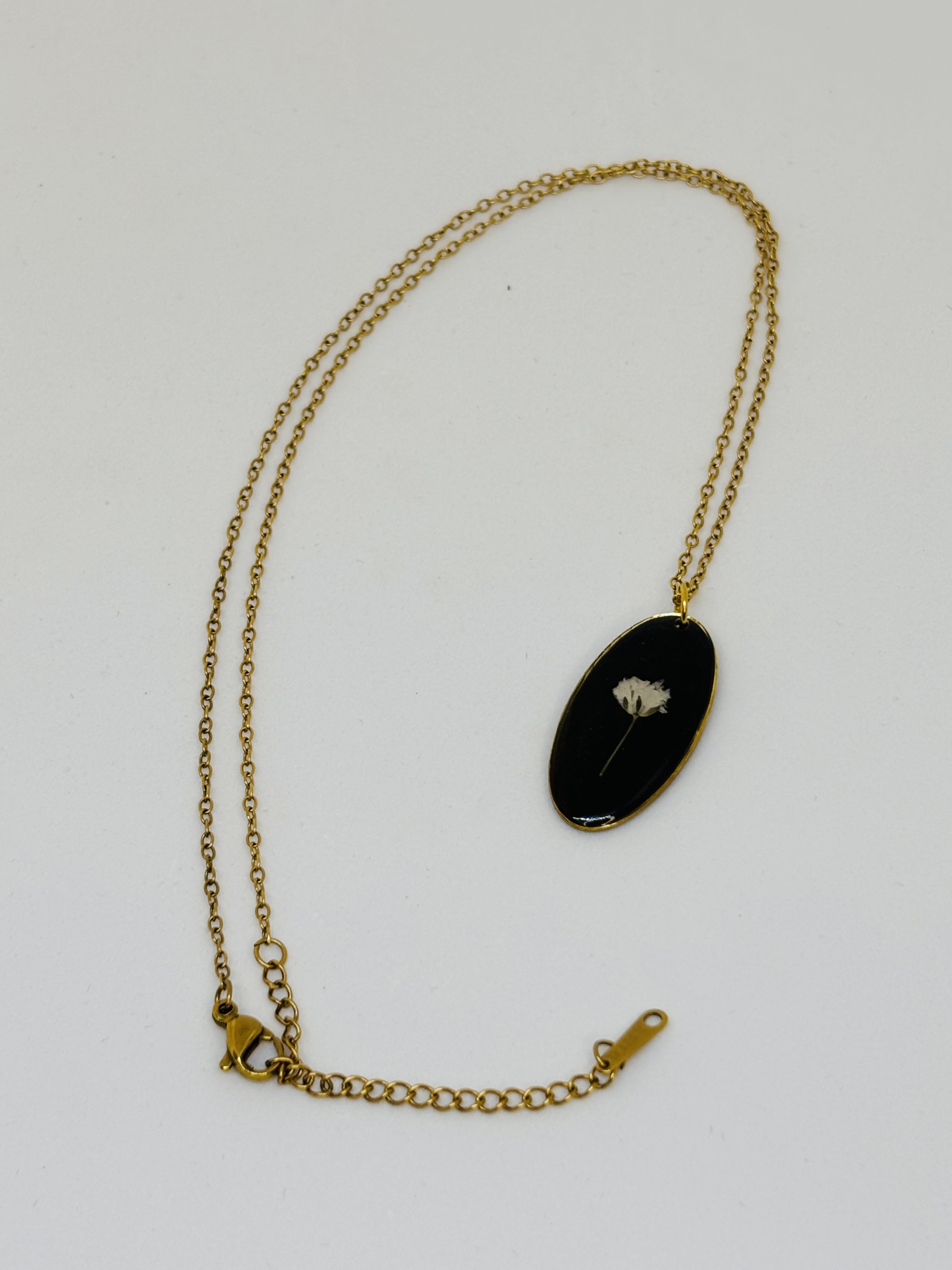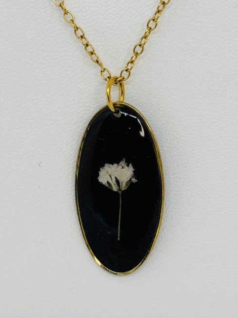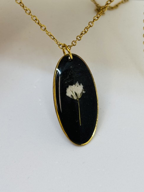 Collier en résine avec fleurs de Gypsohile blanche et fond noir – Bijou artisanal en acier inoxydable doré