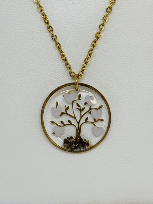 Collier en résine avec fleurs de Gypsohile – Bijou artisanal en acier inoxydable doré