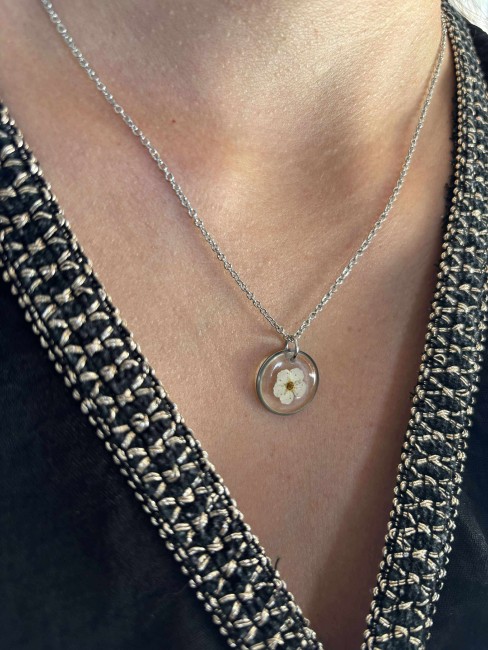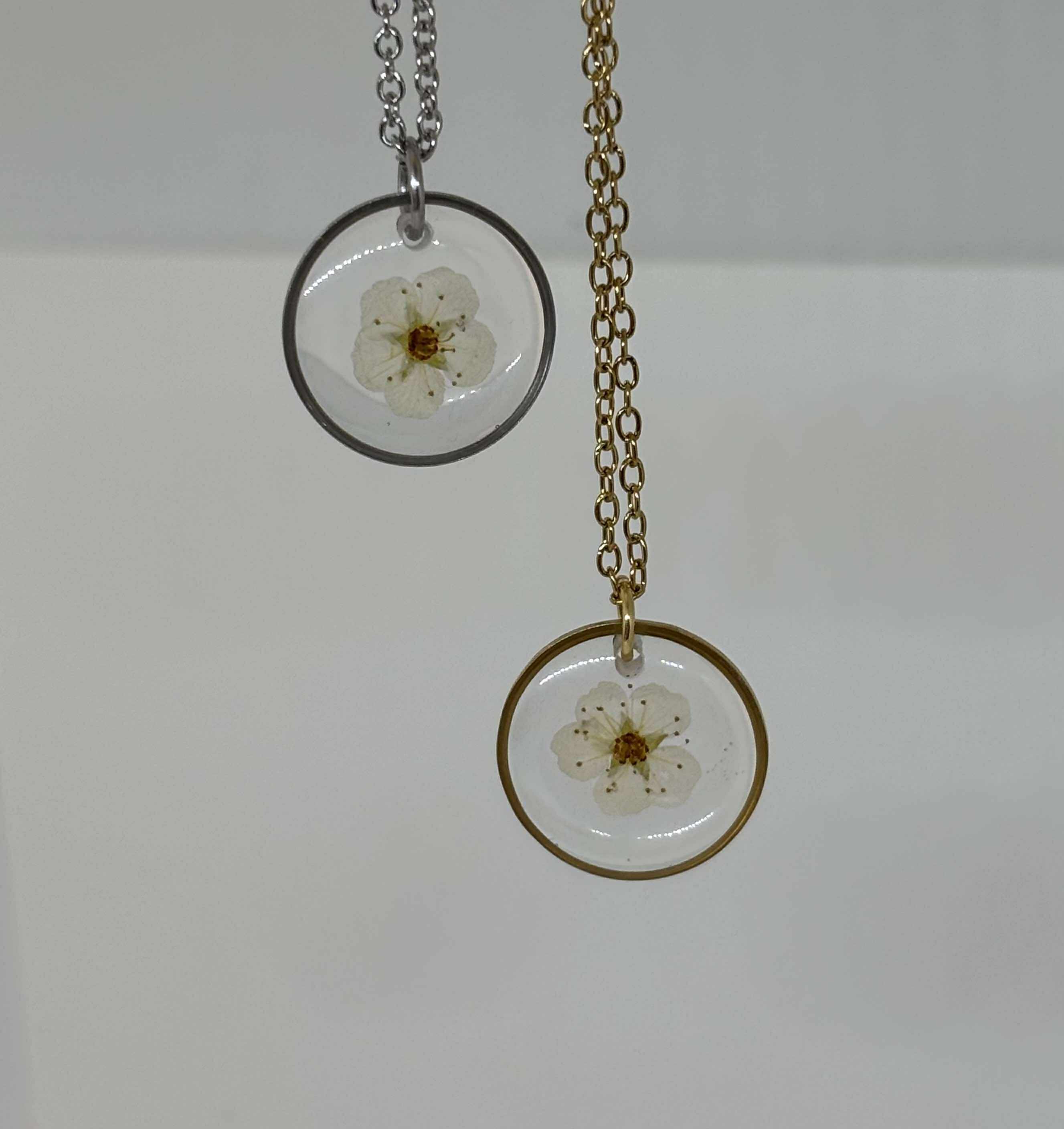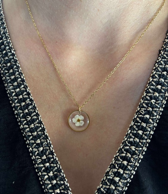 Collier en résine avec fleur de Spirée – Bijou artisanal en acier inoxydable doré