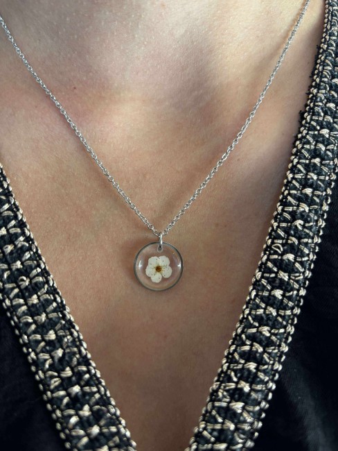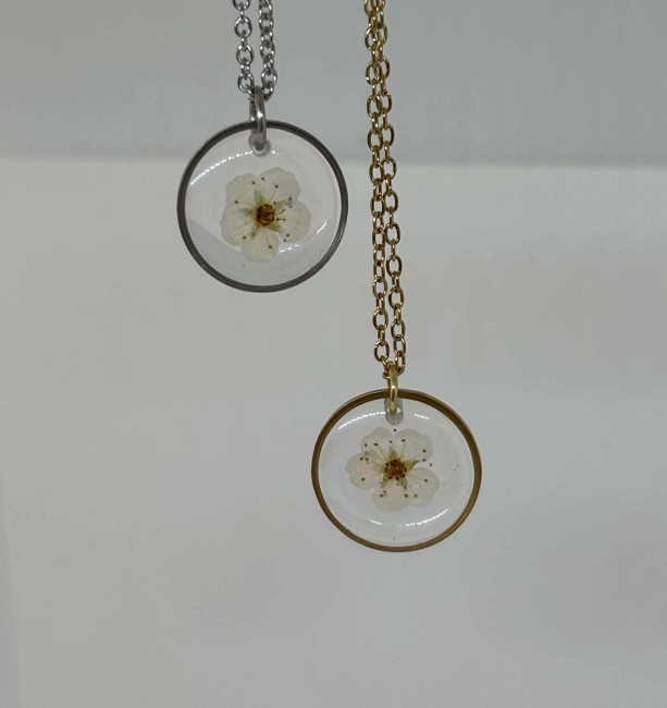 - Pendentif : résine transparente avec inclusion de véritables fleurs de Spirée