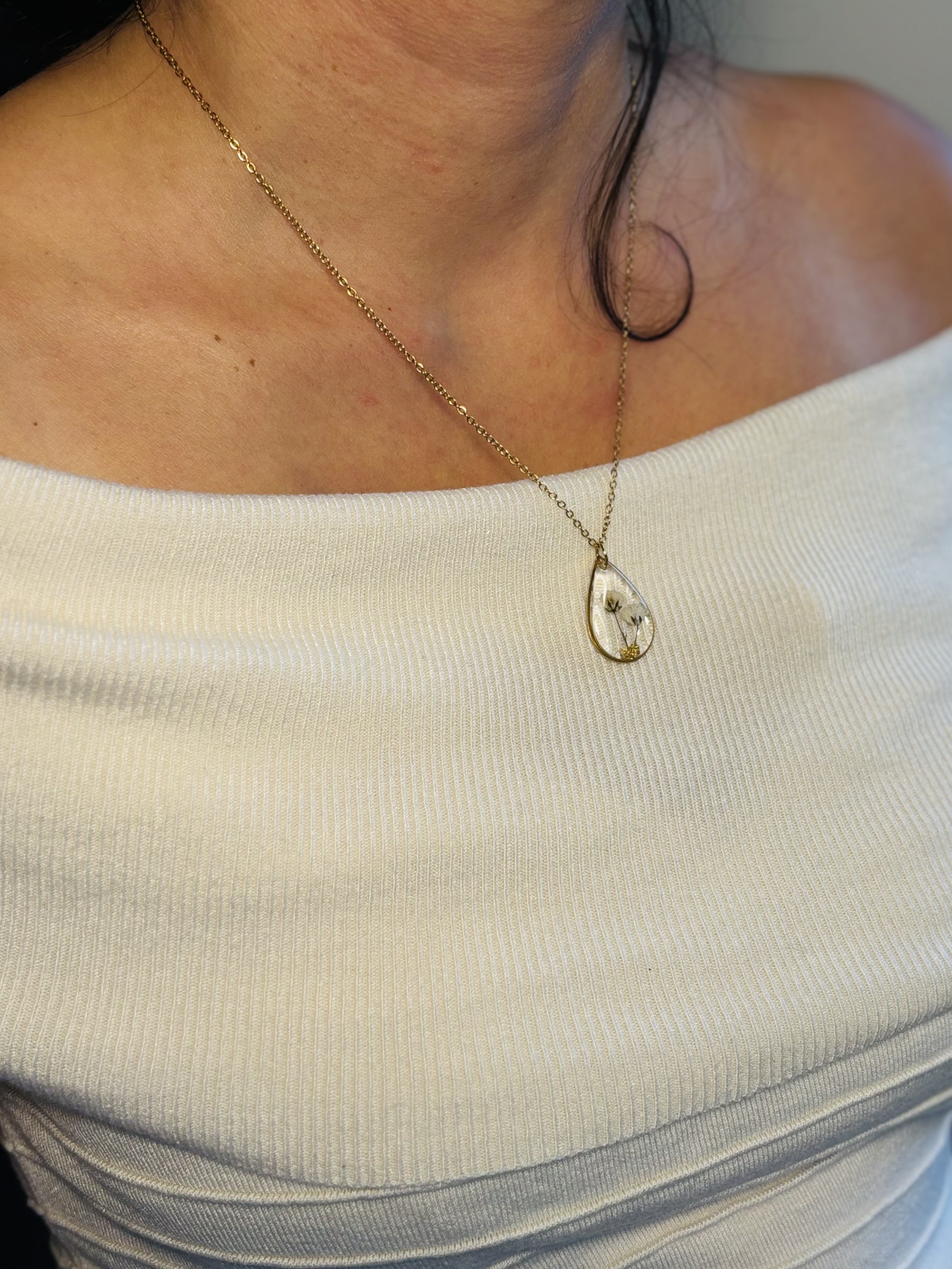 Collier goutte en résine avec fleurs de Gypsohile blanche – Bijou artisanal en acier inoxydable doré