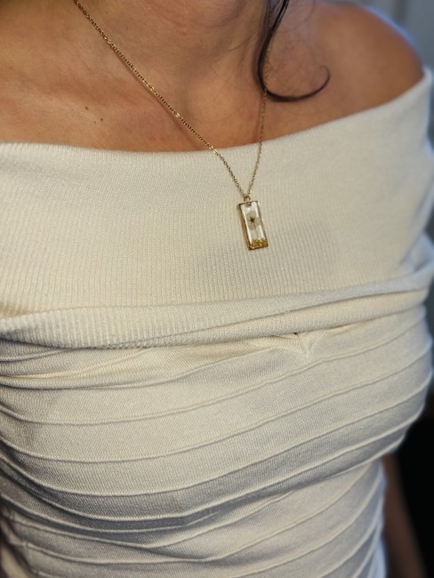 Collier en résine avec fleurs de Gypsohile – Bijou artisanal en acier inoxydable doré