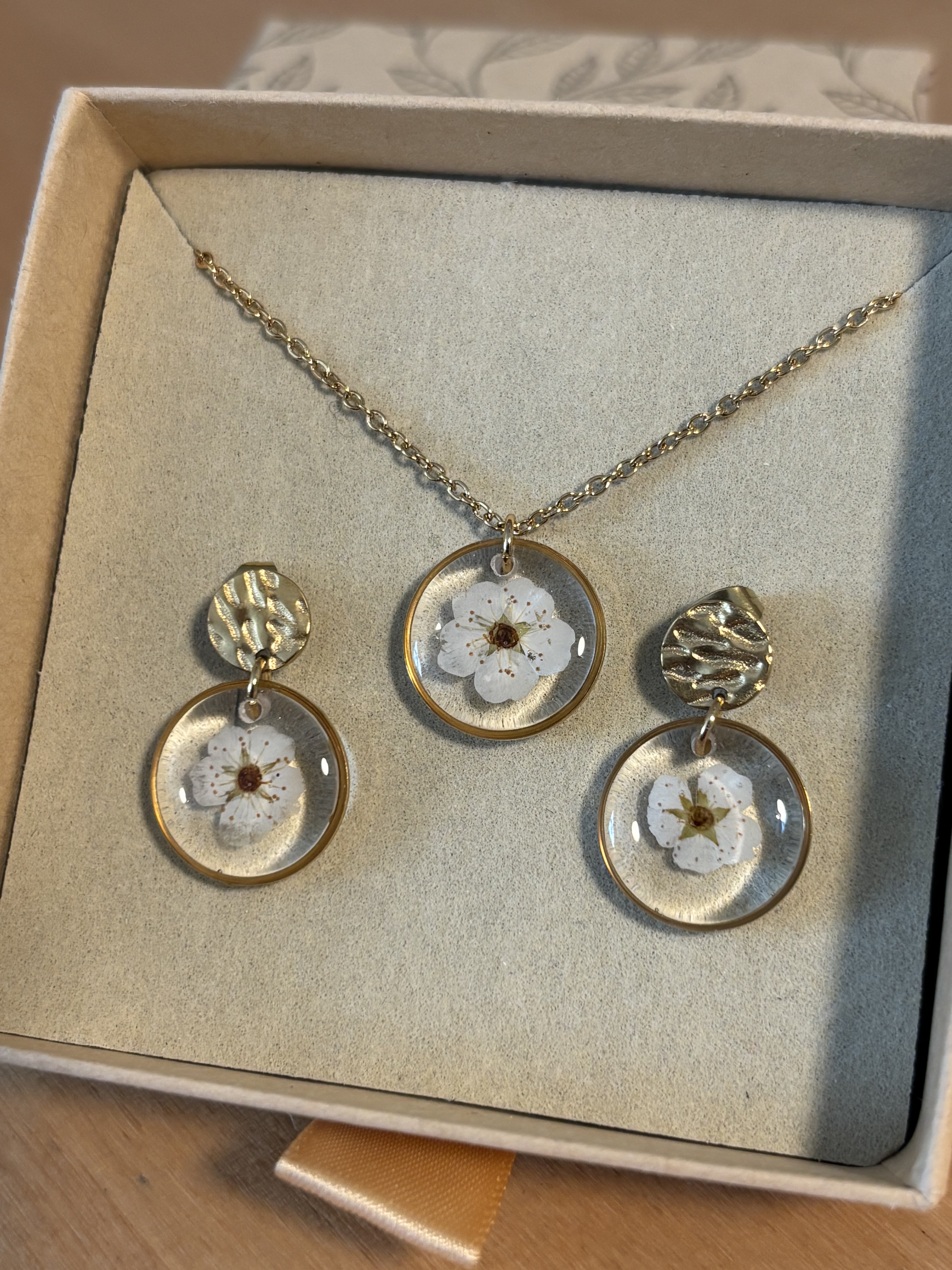 - Pendentif : résine transparente avec inclusion de véritables fleurs de Spirée