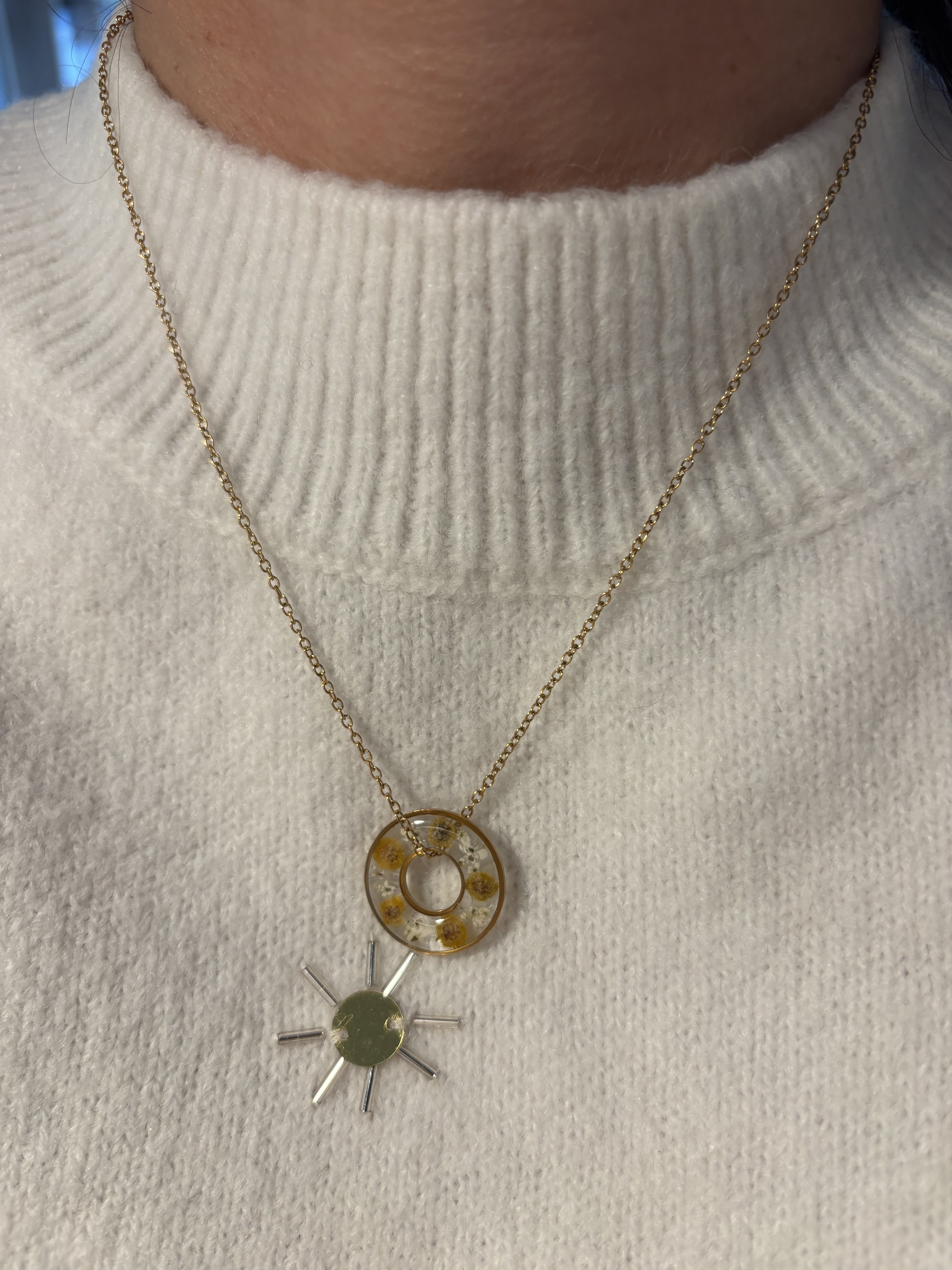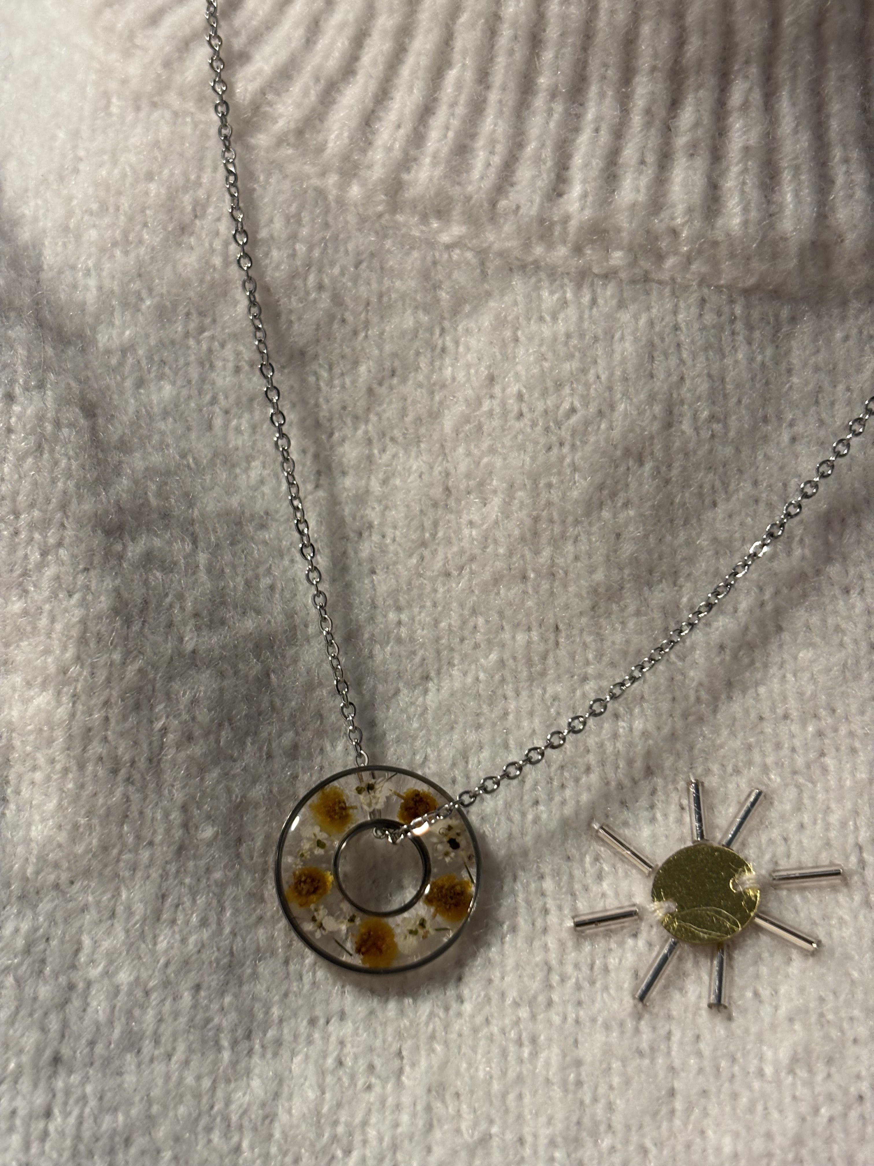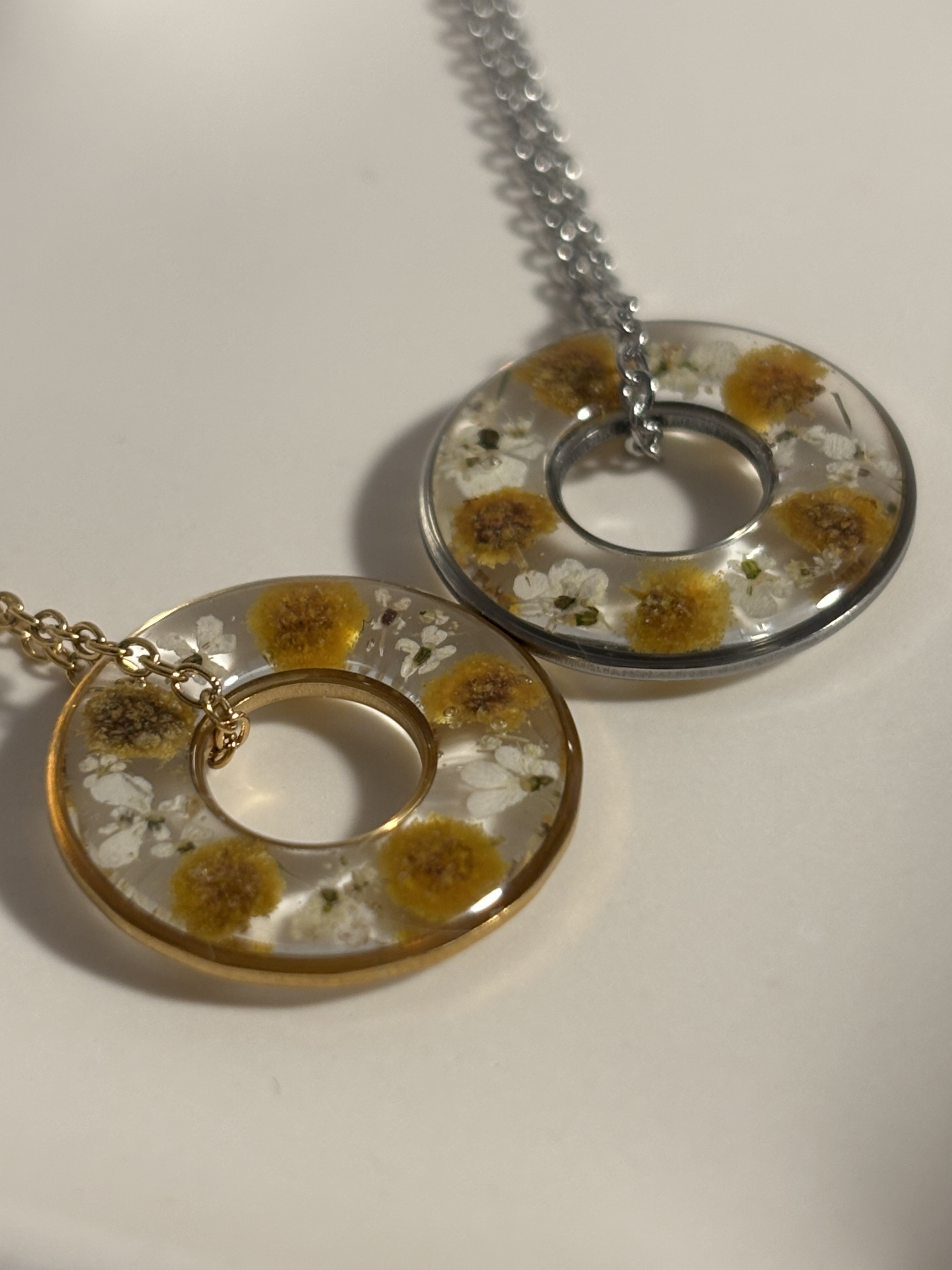 - Pendentif : résine transparente avec inclusion de véritables fleurs de mimosa, carotte sauvage