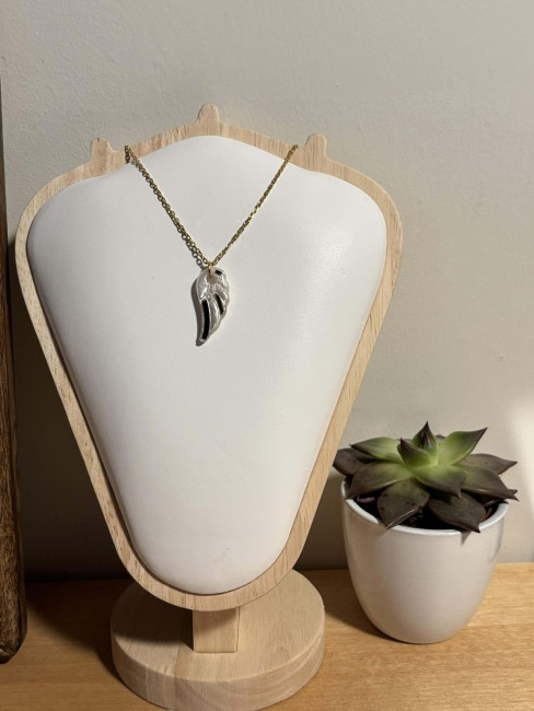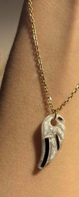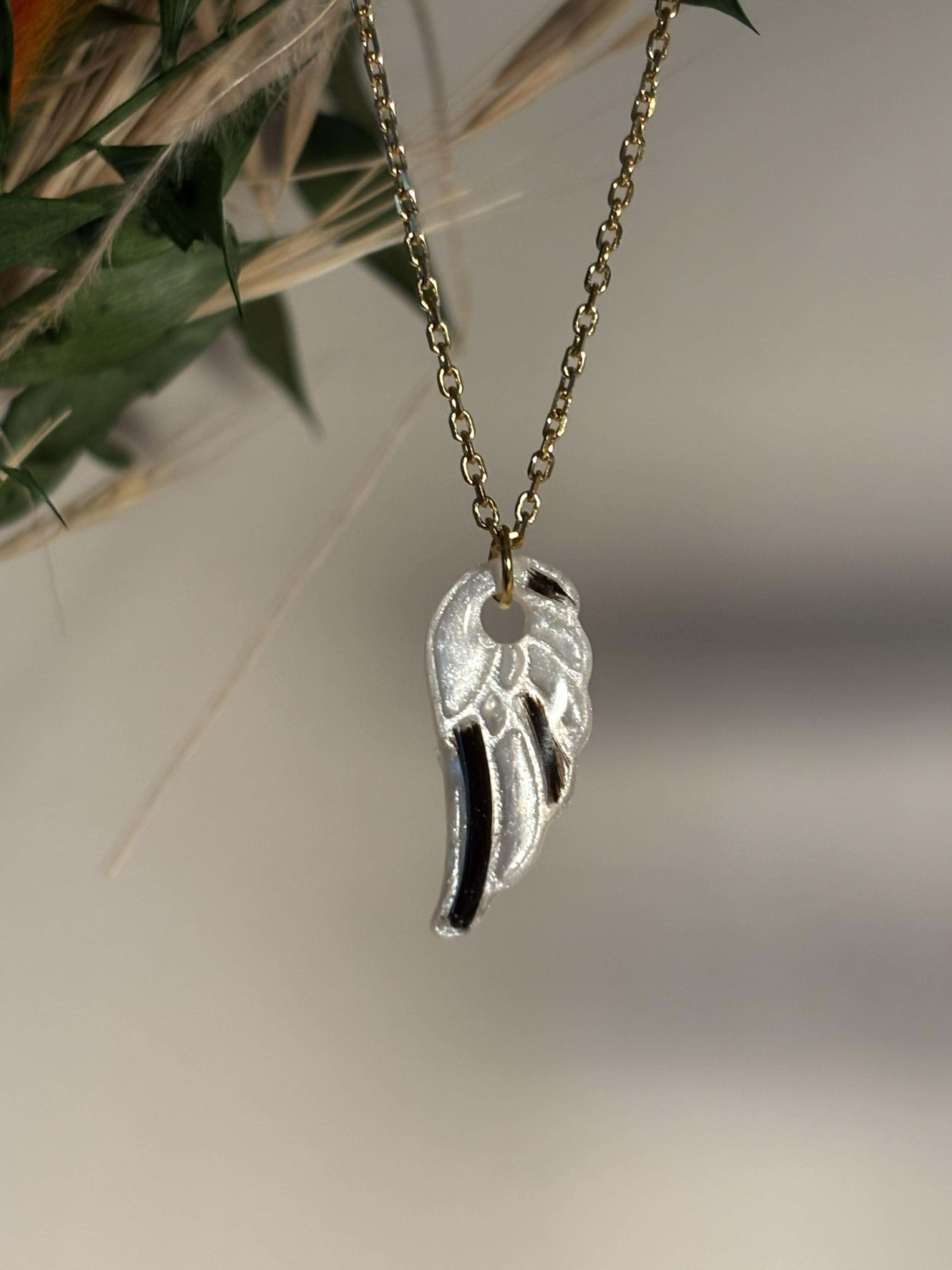 L’aile est réalisée en résine couleur blanc nacré, apportant un éclat subtil et raffiné. Elle peut également être conçue en noir, selon vos envies. Pour rendre ce bijou encore plus personnel, il est possible d’insérer des poils ou des mèches de cheveux, faisant de chaque pièce une création unique et chargée de sens.