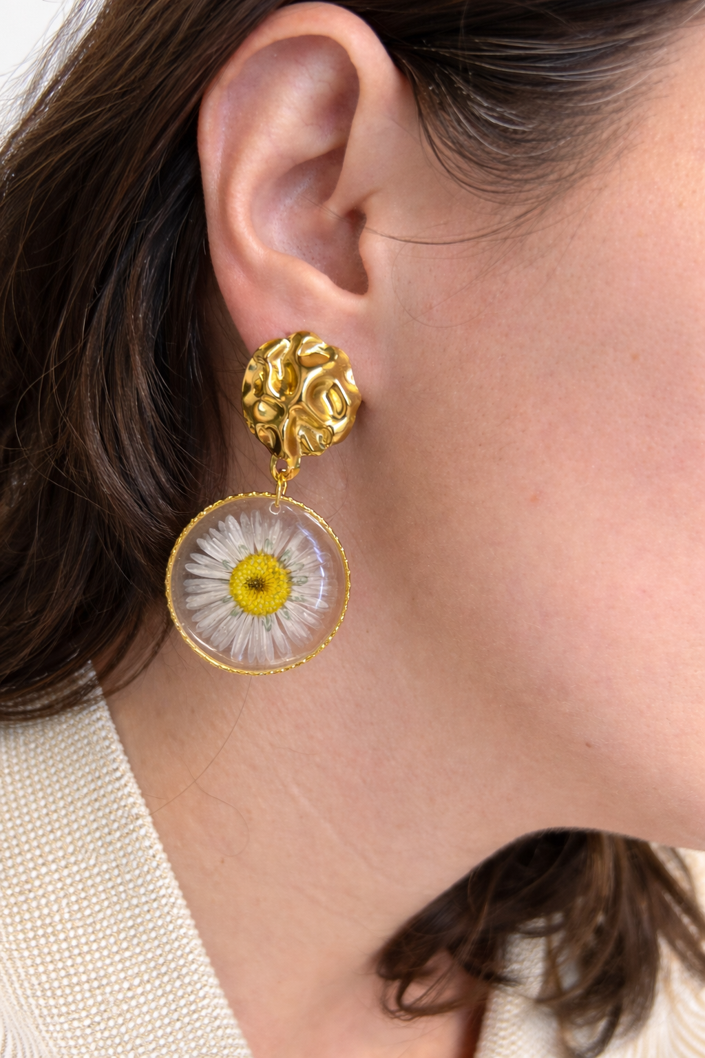 Chaque paire met en valeur une véritable pâquerette, soigneusement intégrée dans de la résine transparente, pour un bijou à la fois lumineux, doux et intemporel.