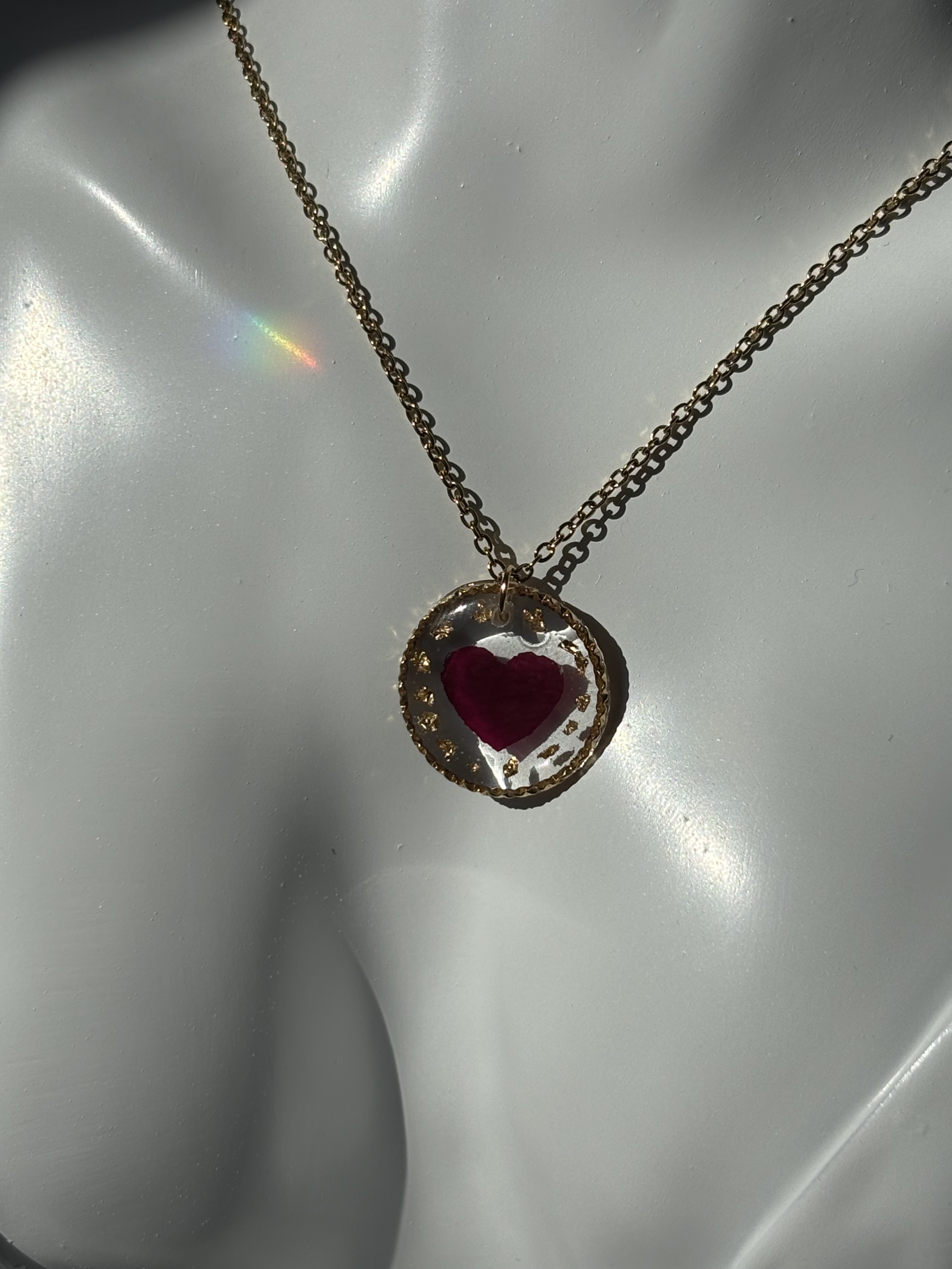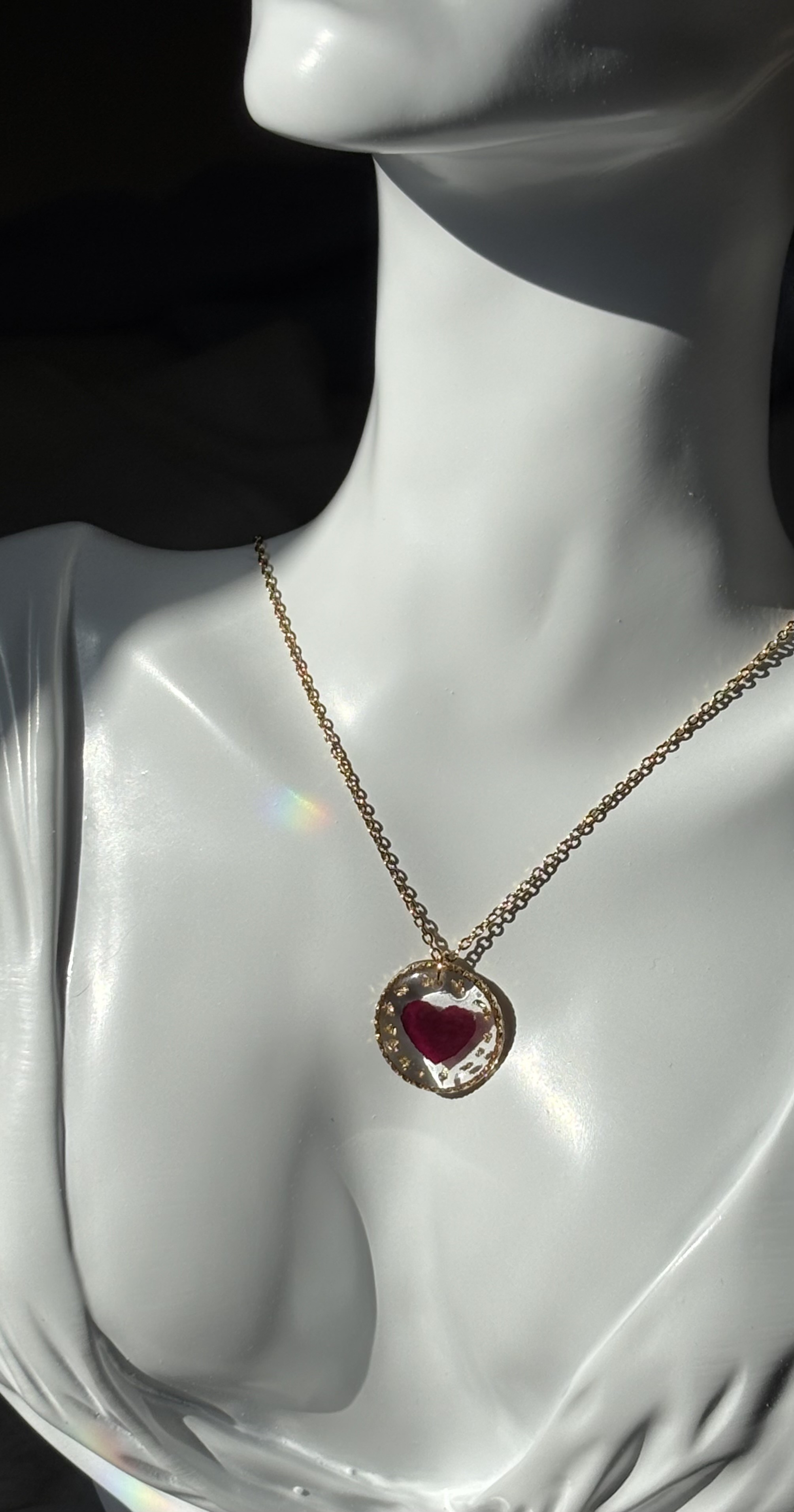 Chaque collier est une pièce unique, réalisée à la main, mettant en valeur la délicatesse d’un vrai pétale de rose, soigneusement conservé dans la résine.
