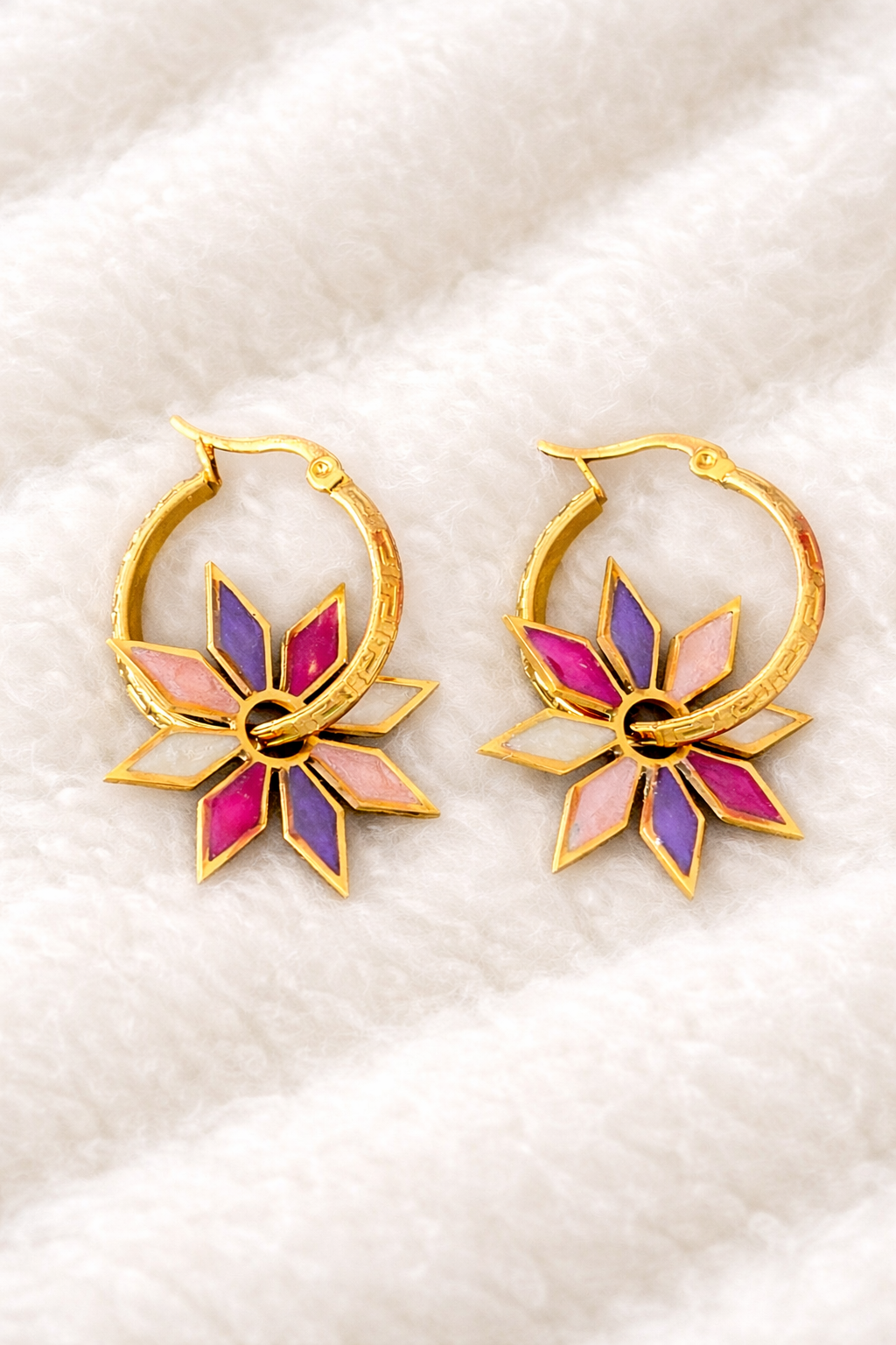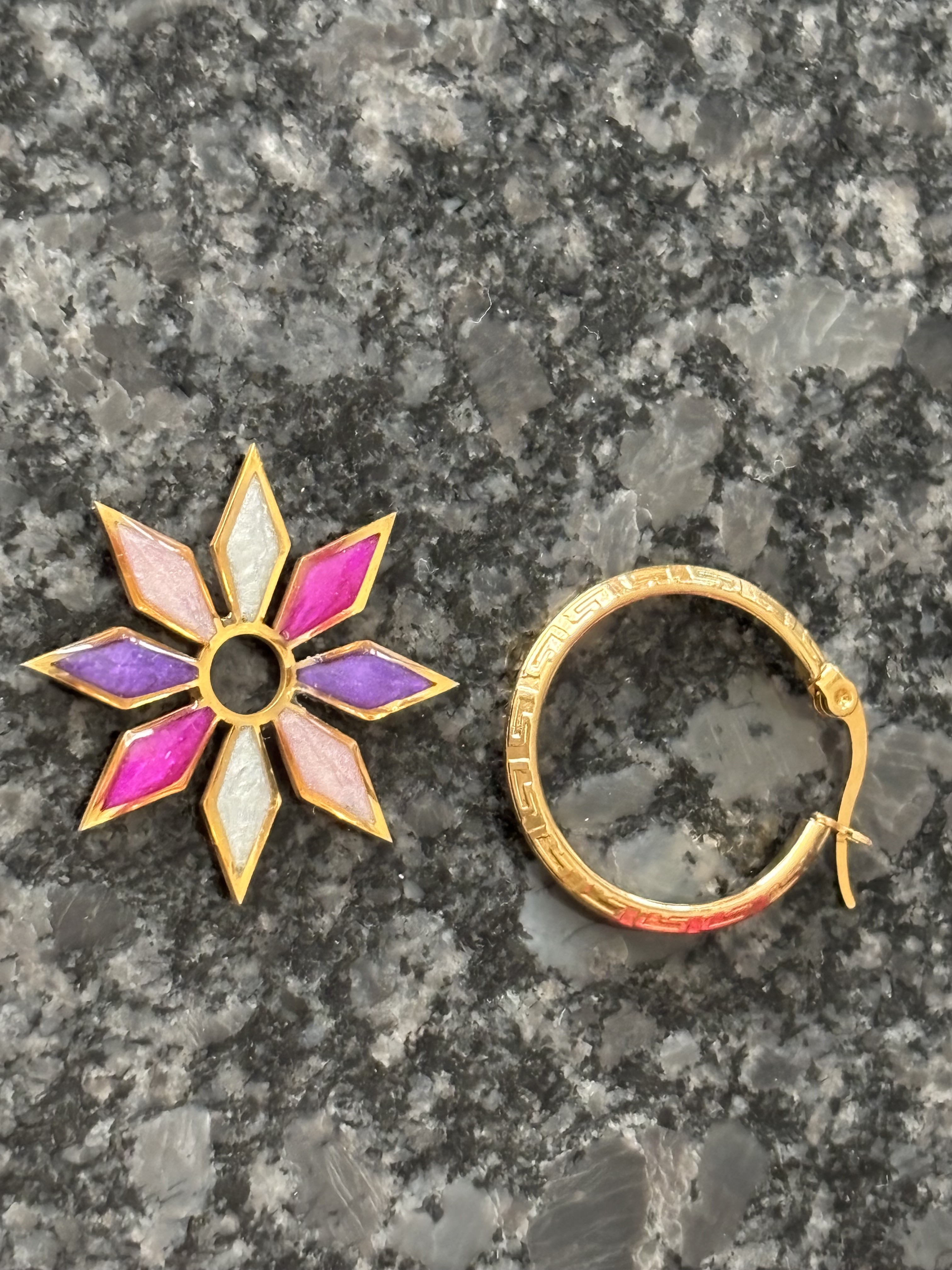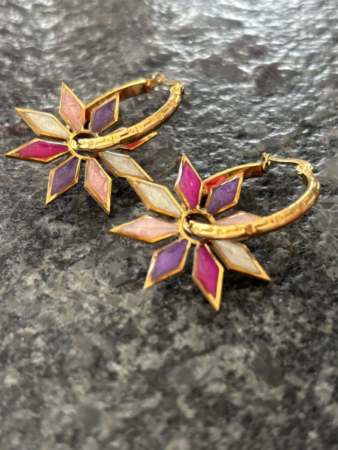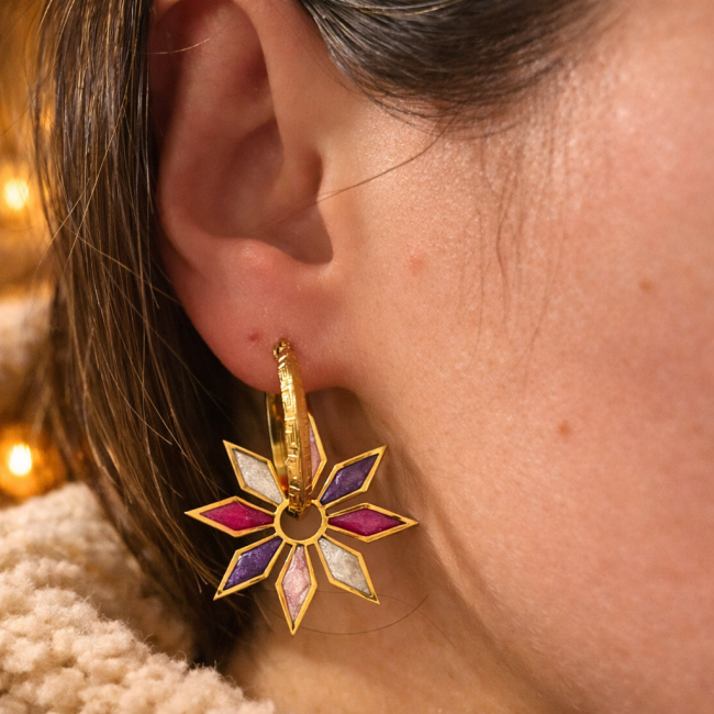 Créoles de 25 mm en acier inoxydable, légères et résistantes, accompagnées de pampilles de 29 mm en résine, réalisées à la main avec soin. Chaque paire est unique, avec de jolies couleurs qui apportent une touche lumineuse et originale à vos tenues.