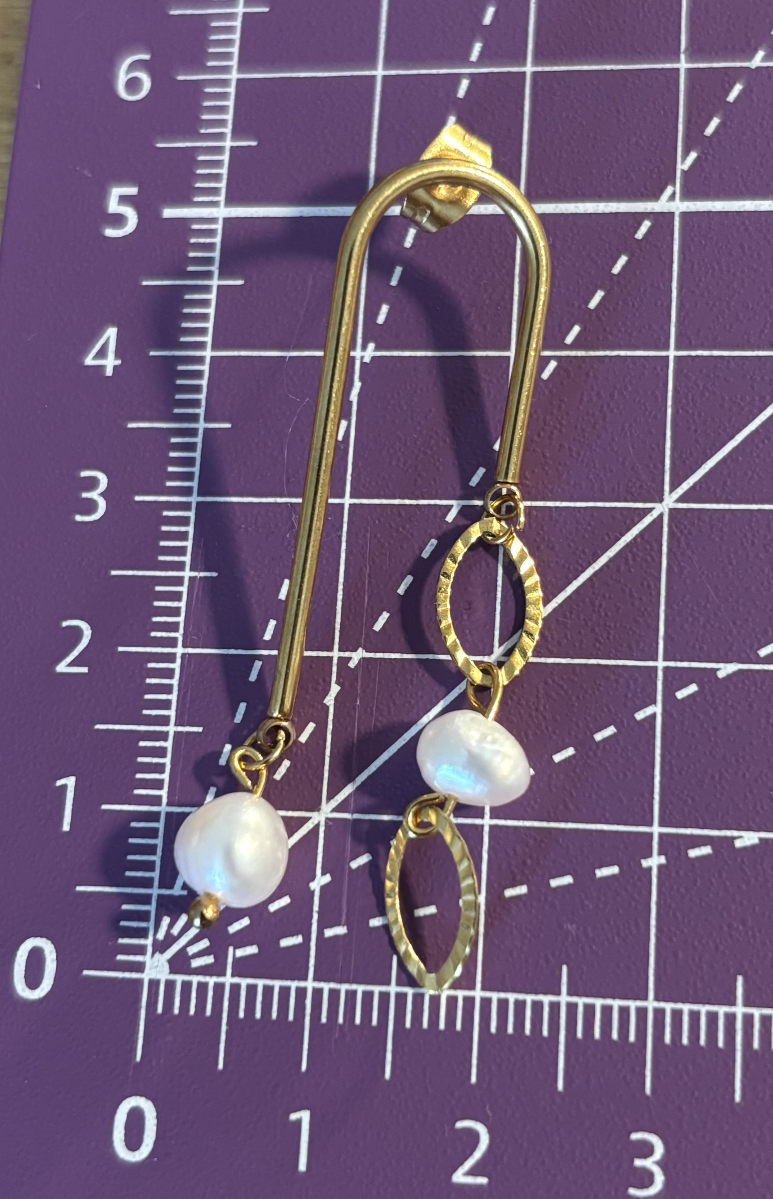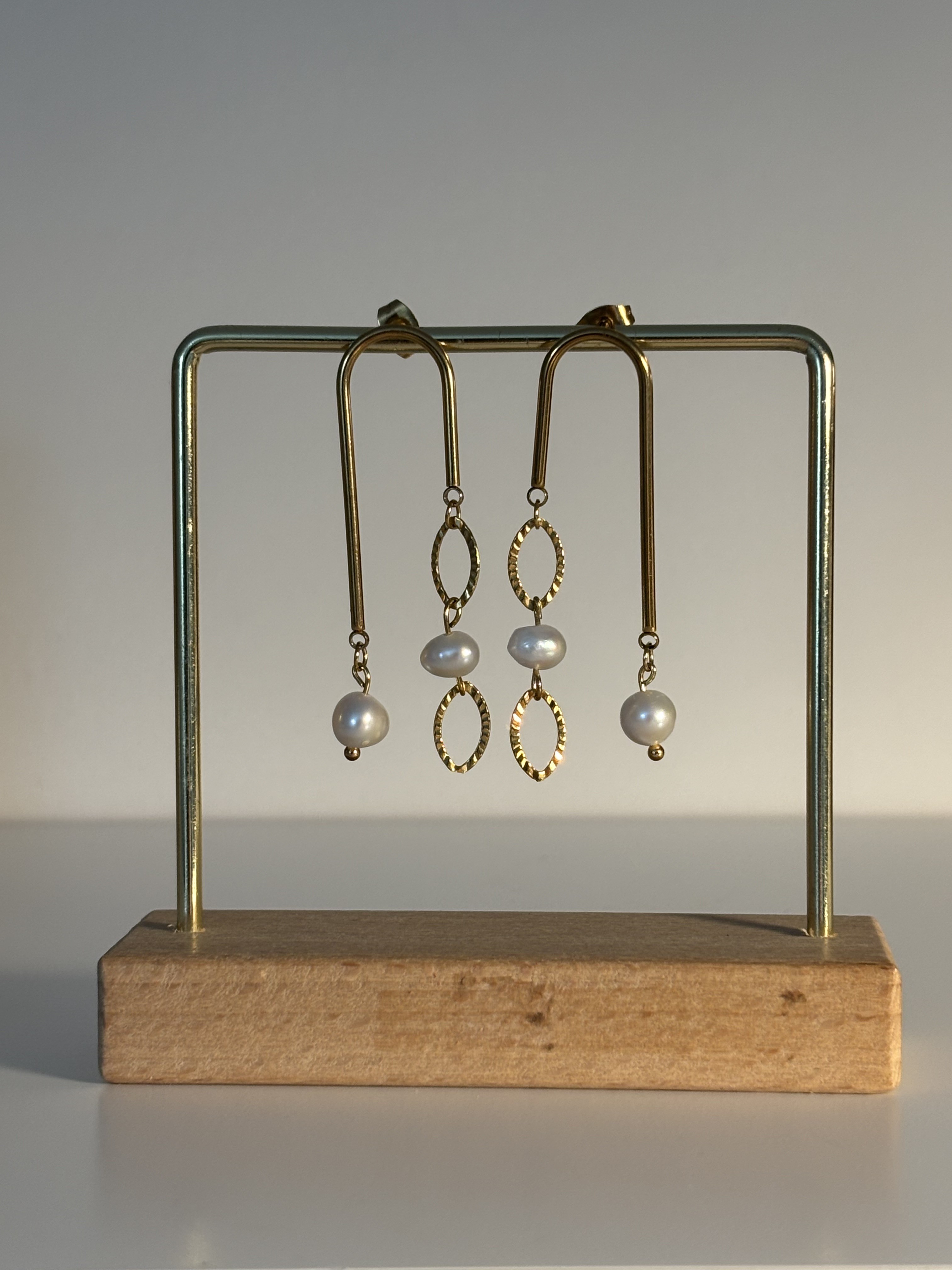 Boucles d’oreilles en acier inoxydable et perles d’eau douce, entièrement assemblées à la main.