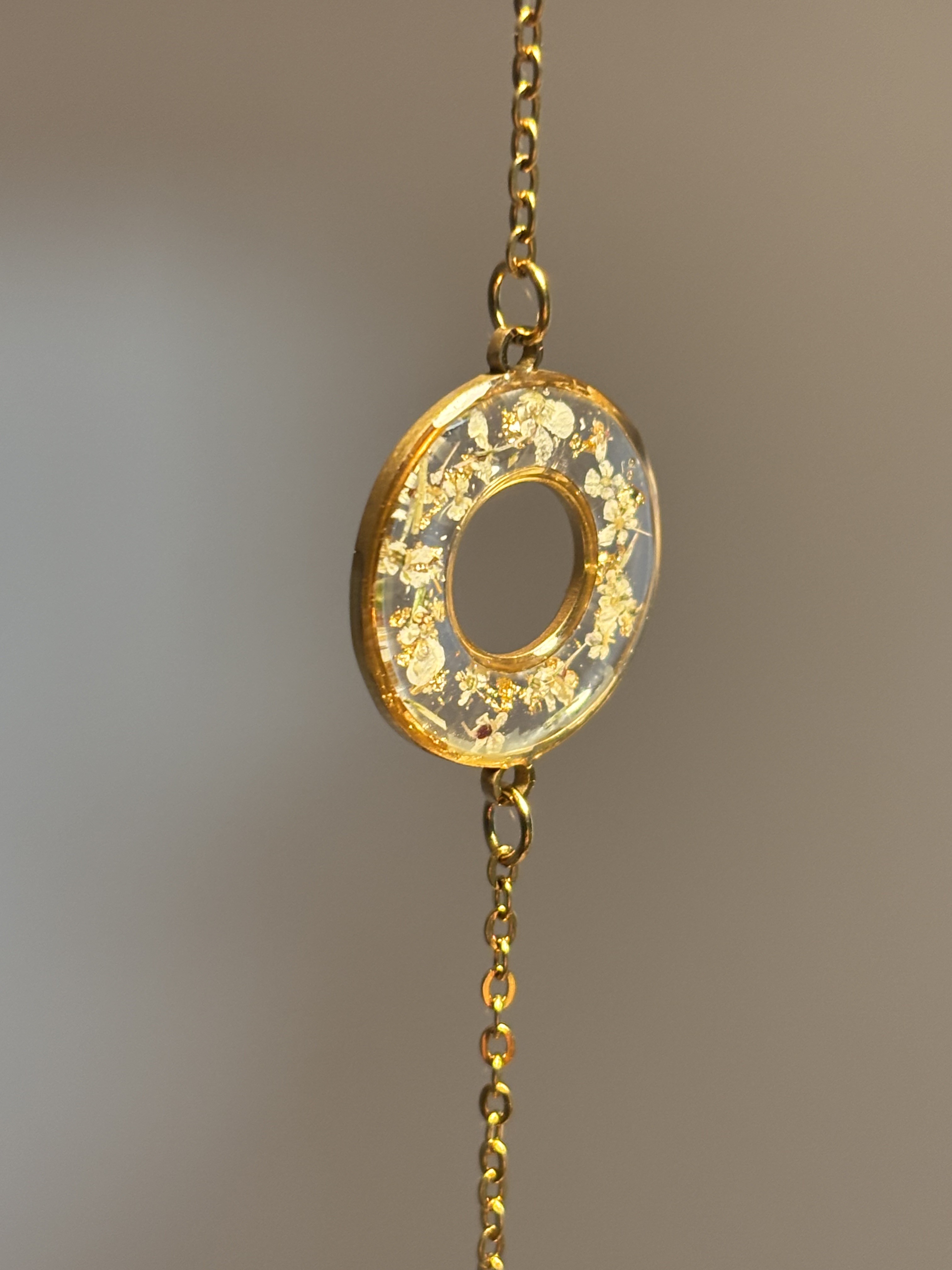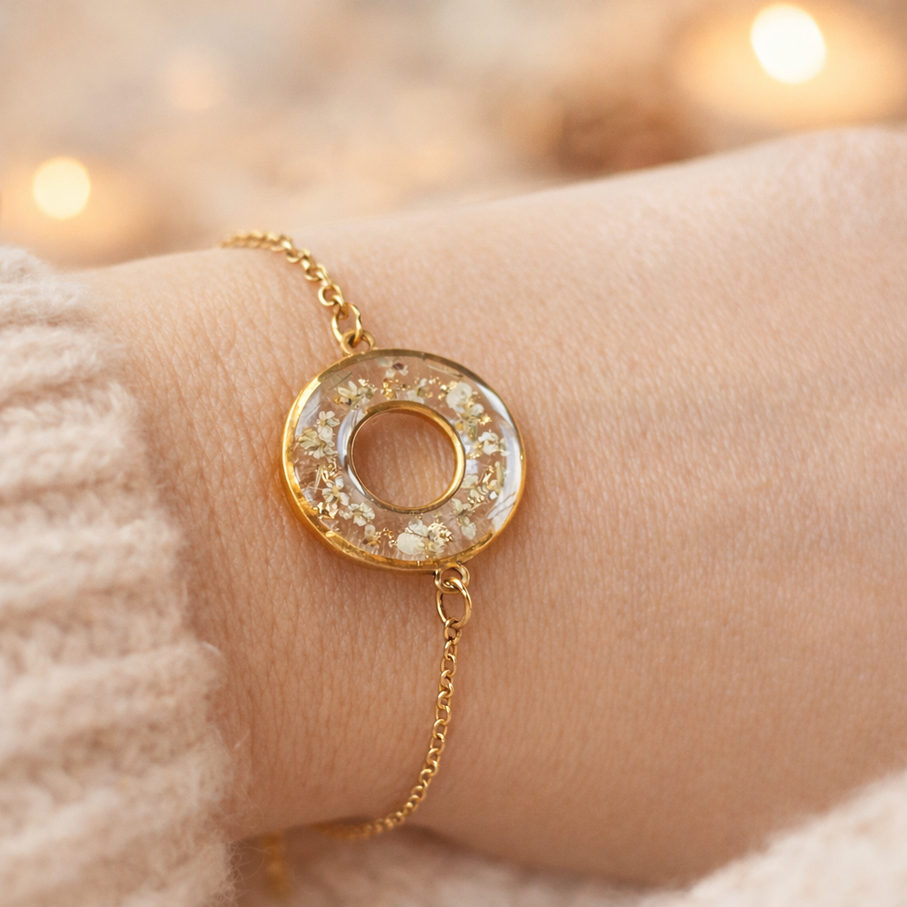 À l’intérieur, de véritables fleurs séchées de carotte sauvage, délicatement mises en valeur avec de fines feuilles dorées, le tout coulé dans la résine.