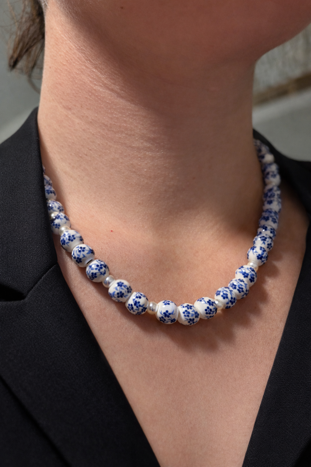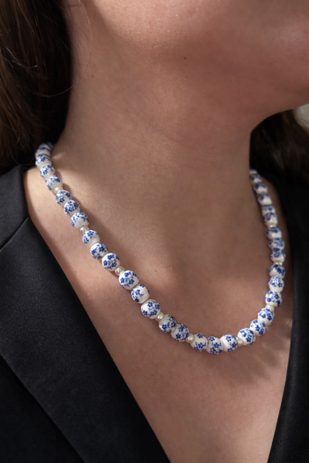 Le collier est composé de perles en céramique, de perles en verre, de laiton, d’un fermoir et d’une chaînette d’extension en acier inoxydable.