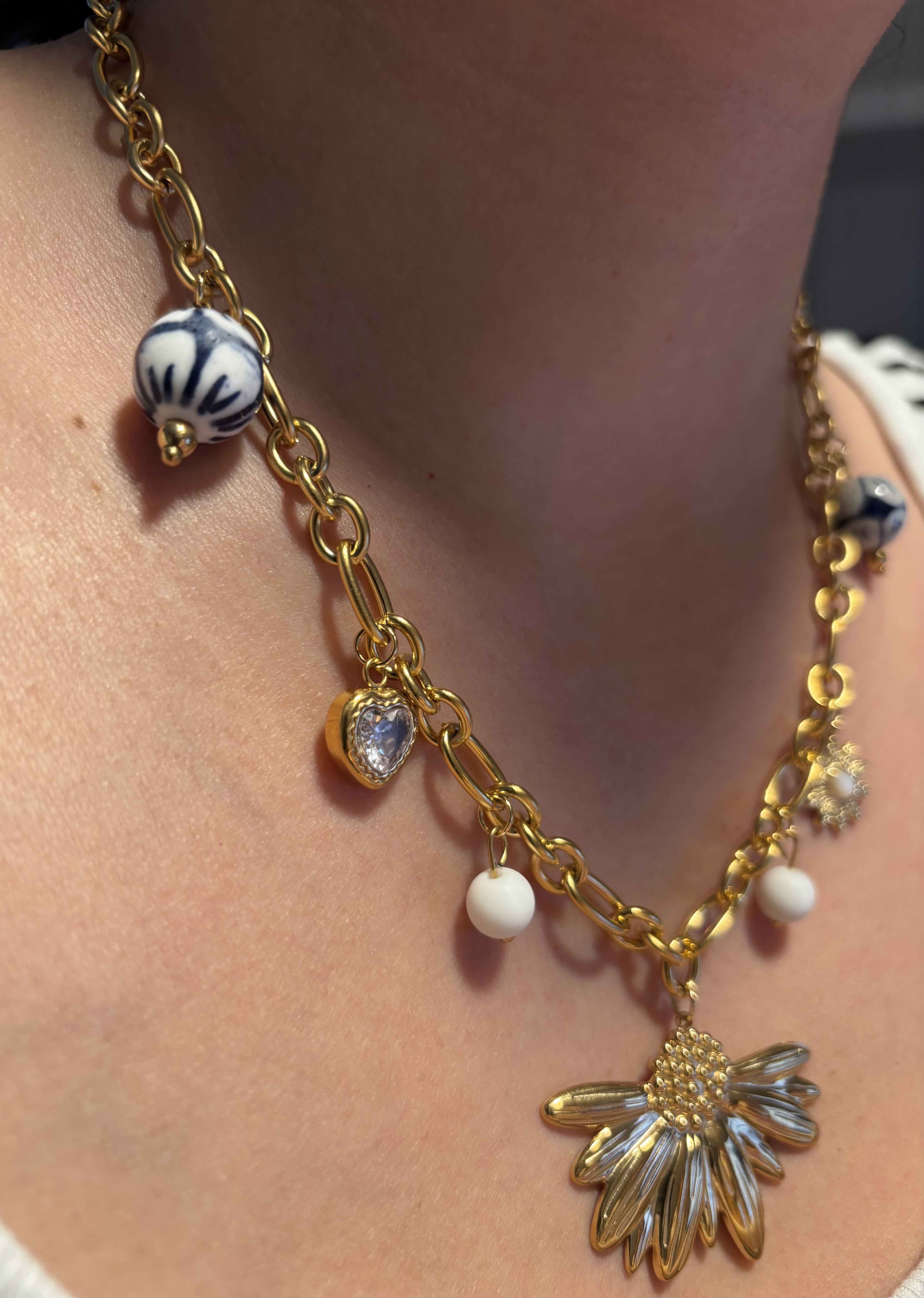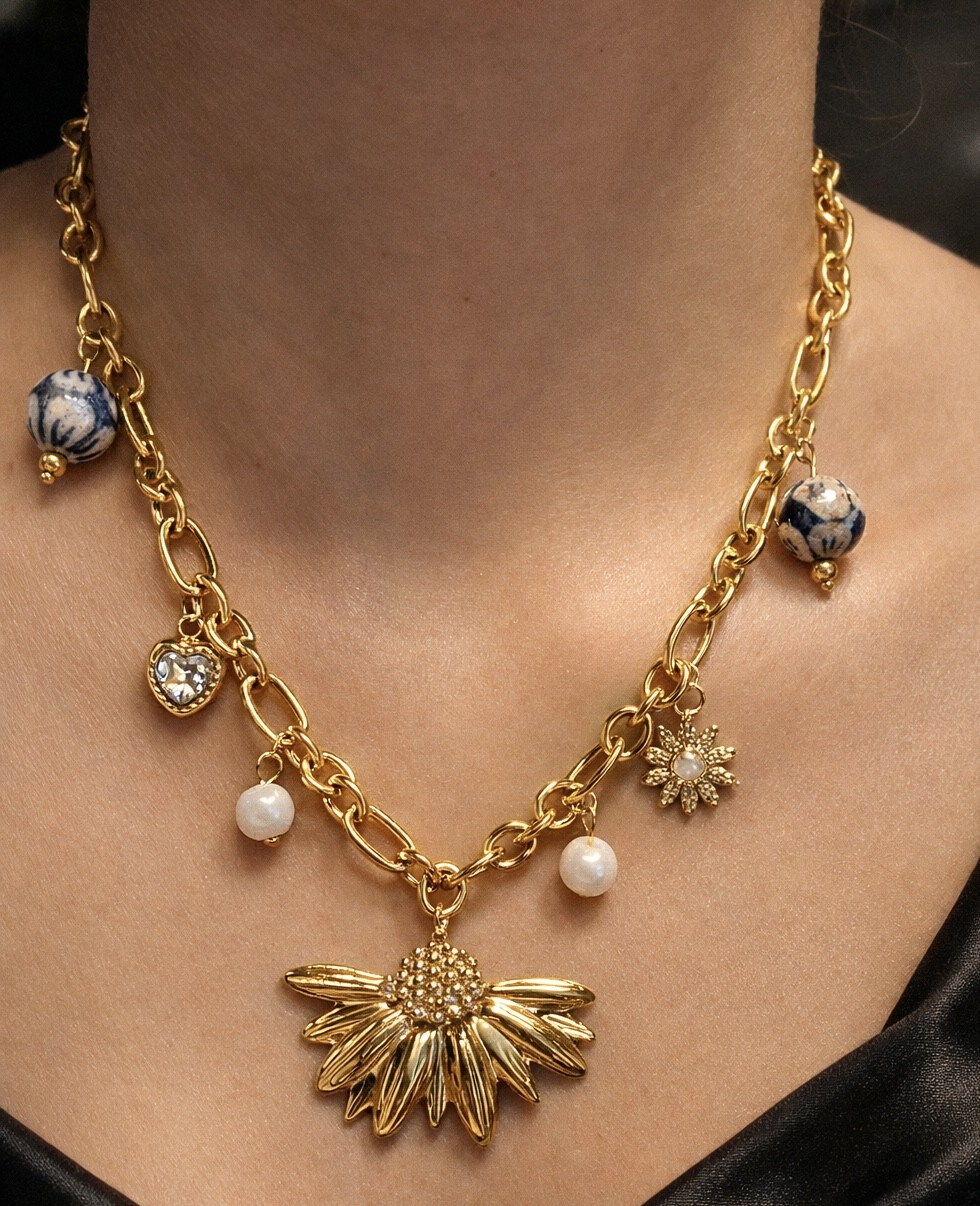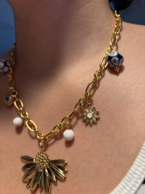 Confectionné en acier inoxydable, il allie résistance et éclat durable. Il est composé de perles en céramique, de perles en acrylique effet Pollock, ainsi que de délicates breloques qui subliment l’ensemble avec une note chic et moderne.