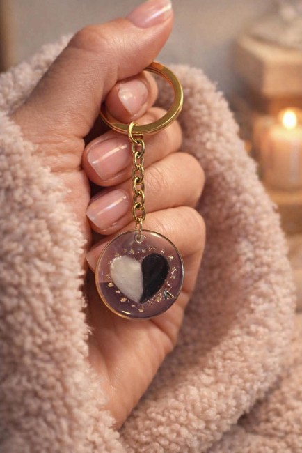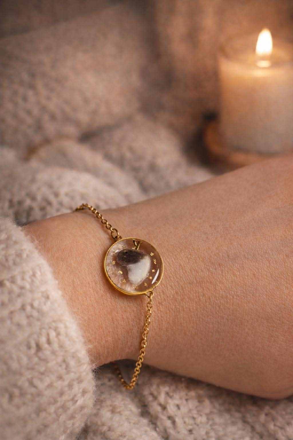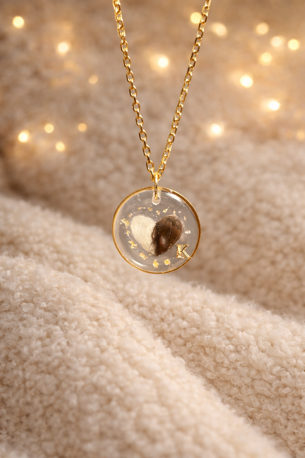 Collier, bracelet et porte-clés en acier inoxydable doré, avec un cerclage rond. À l’intérieur se trouve une forme de cœur contenant de véritables poils de chat.
