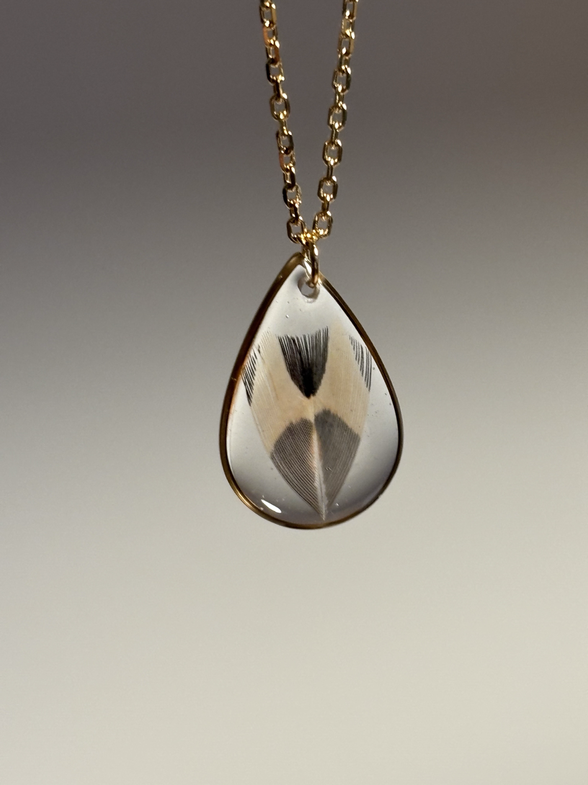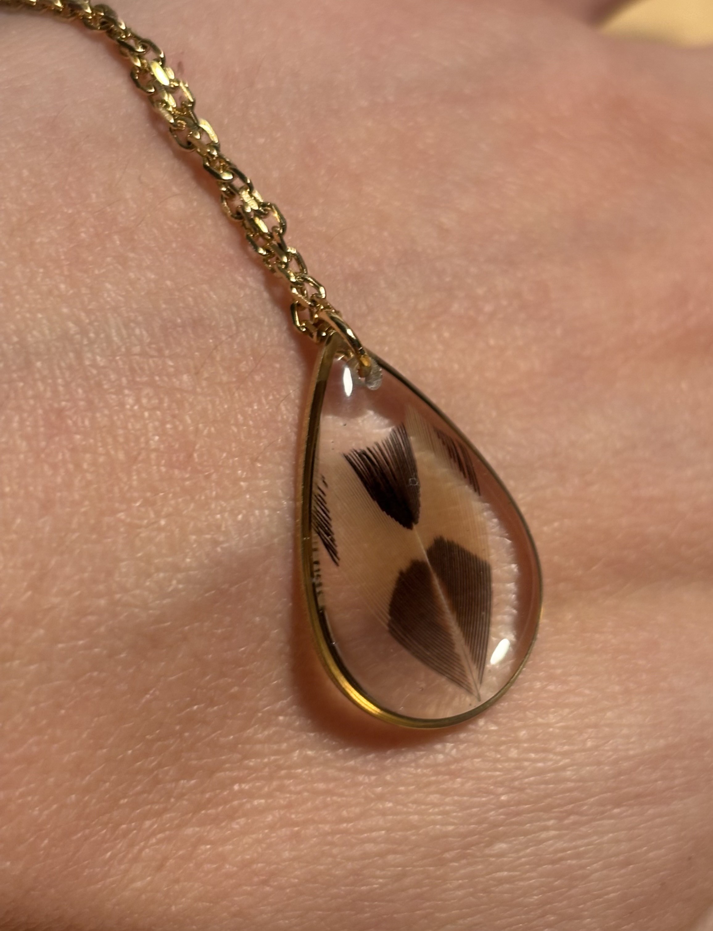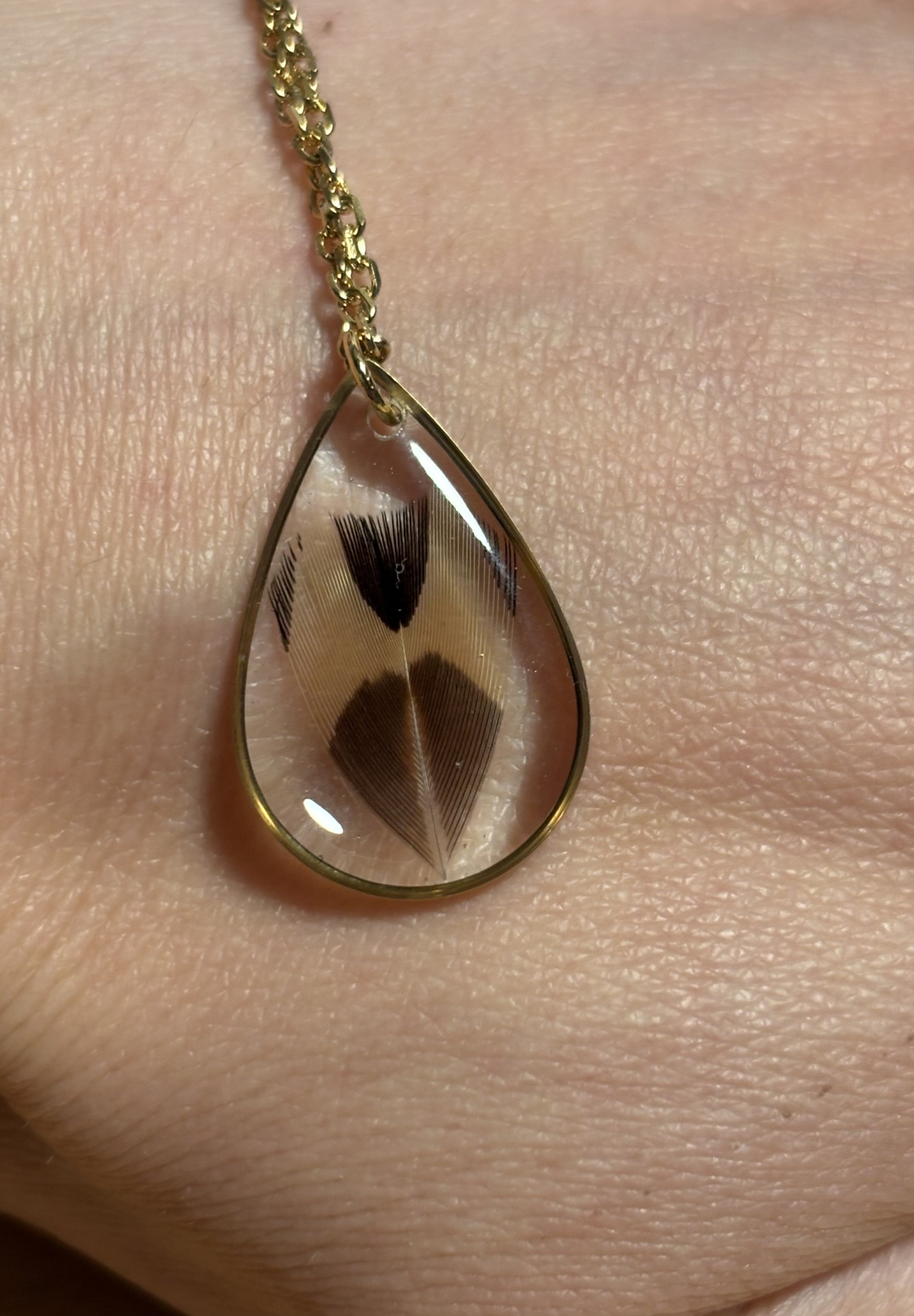 Élégant et naturel, ce collier met en valeur une véritable plume de faisan délicatement encapsulée dans de la résine transparente, révélant toute la finesse et les détails de la plume. Chaque pendentif est unique et apporte une touche poétique et authentique.