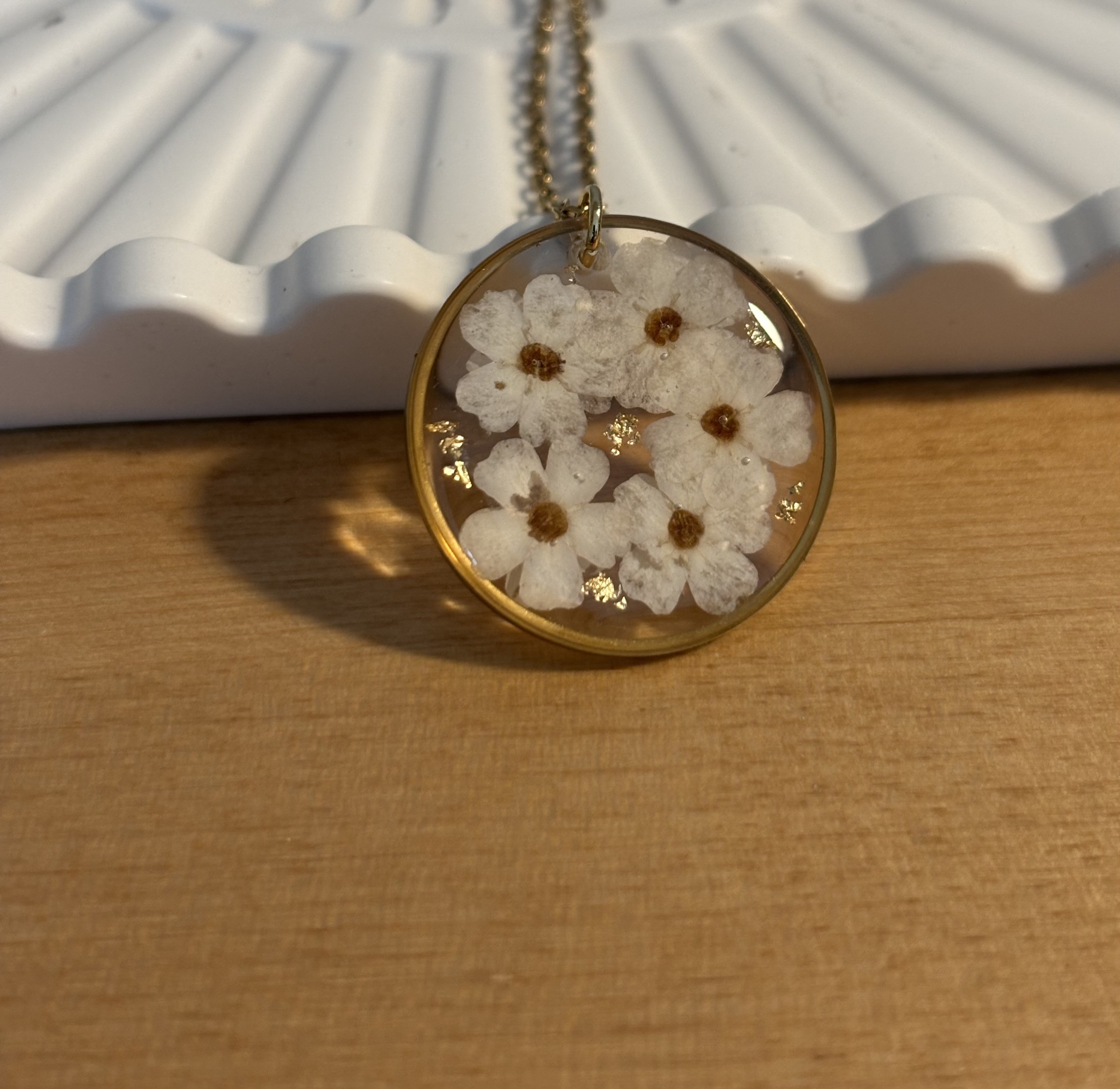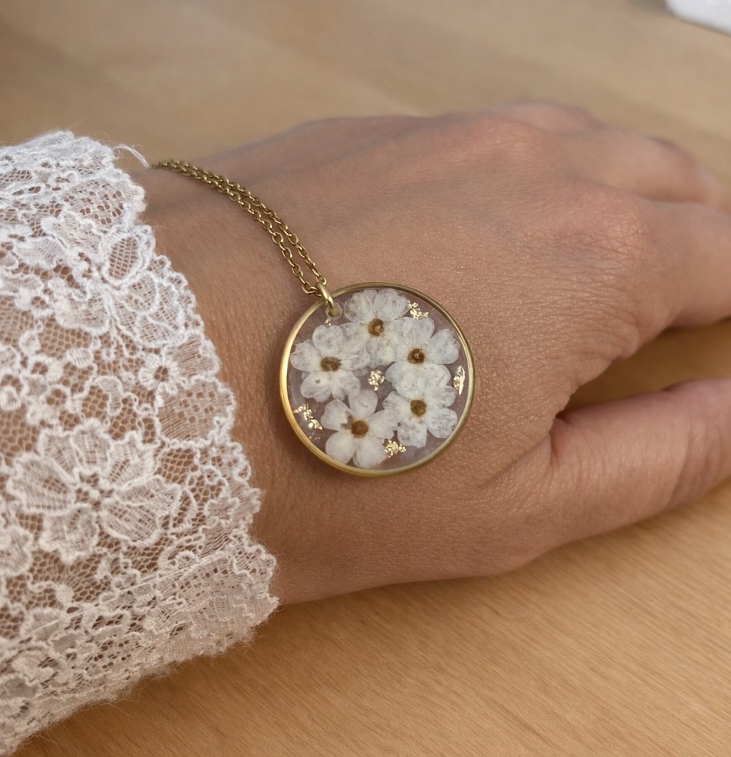 Laissez-vous charmer par la douceur de ce collier unique, réalisé à partir de véritables myosotis blancs cueillis à la main dans mon jardin 🤍