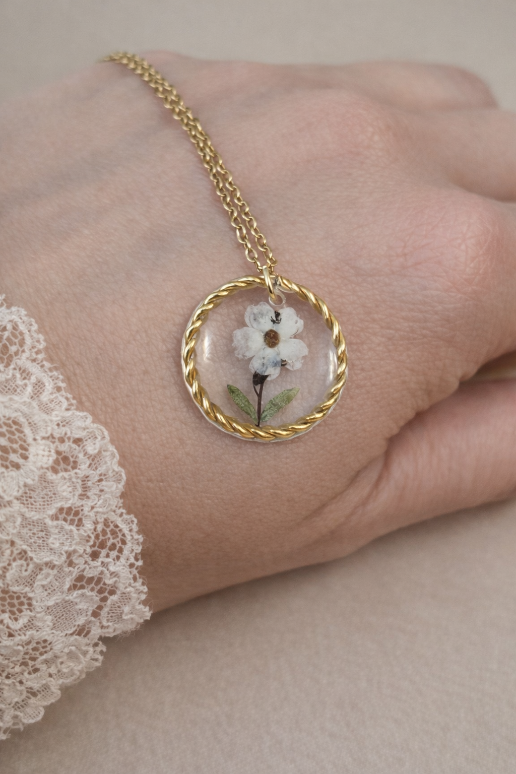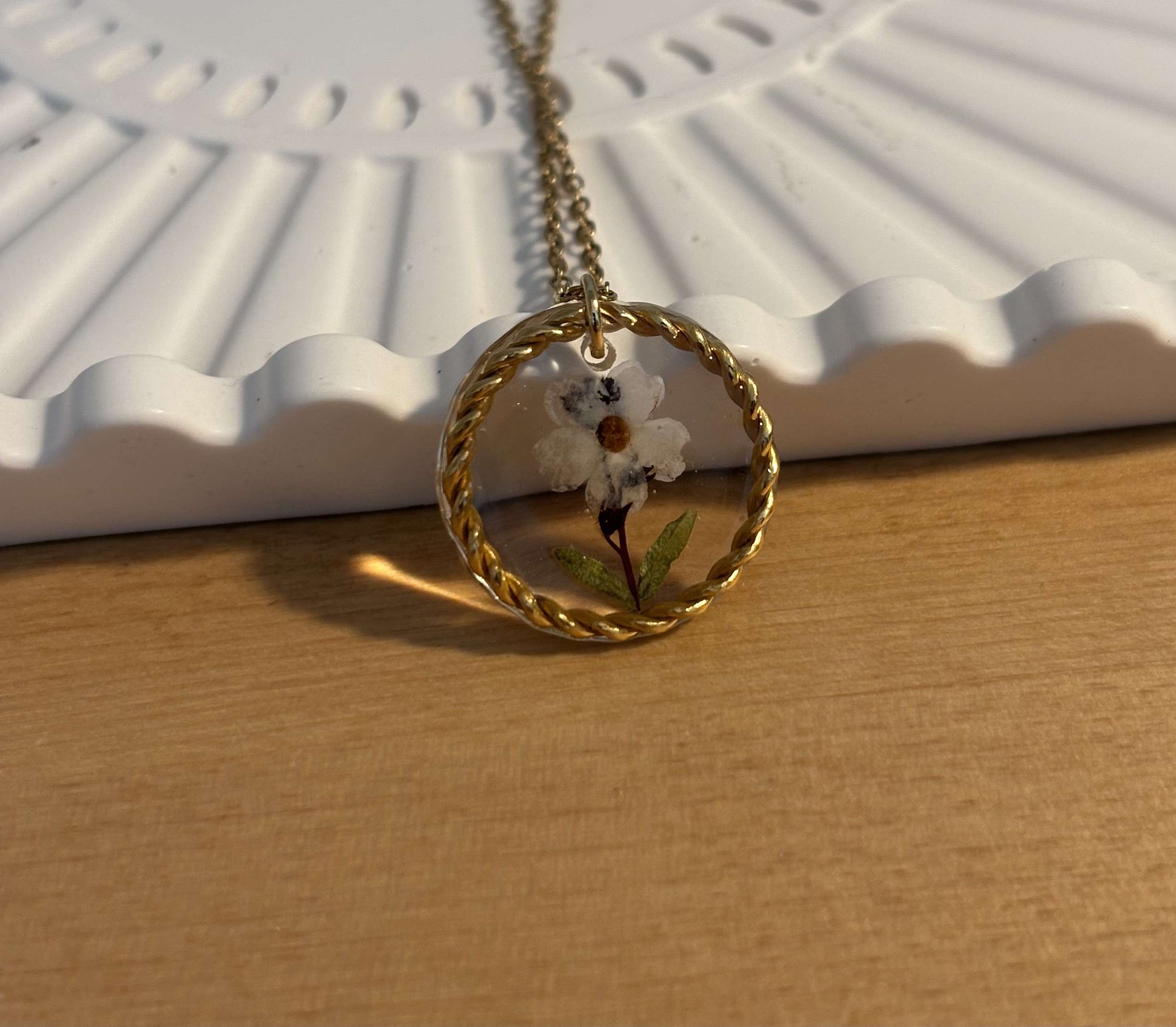 Au cœur de ce bijou, de véritables fleurs de myosotis blanches, cueillies avec soin dans mon jardin, puis minutieusement séchées et sublimées pour conserver toute leur beauté naturelle.