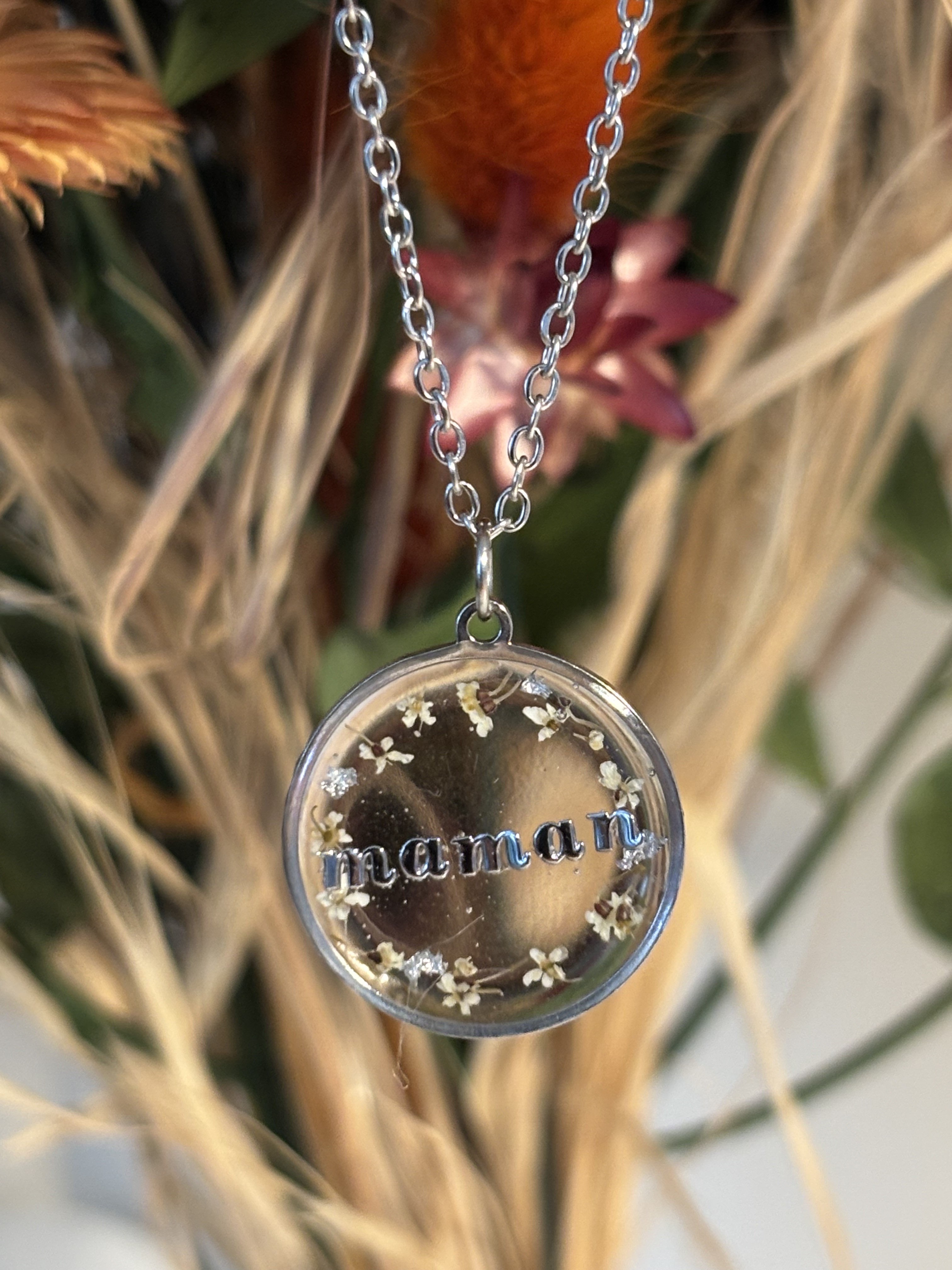 Pendentif en résine avec fleurs naturelles