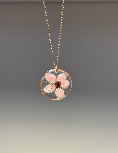 Collier résine avec fleur de cerisier – Bijou artisanal en acier inoxydable doré ou argenté